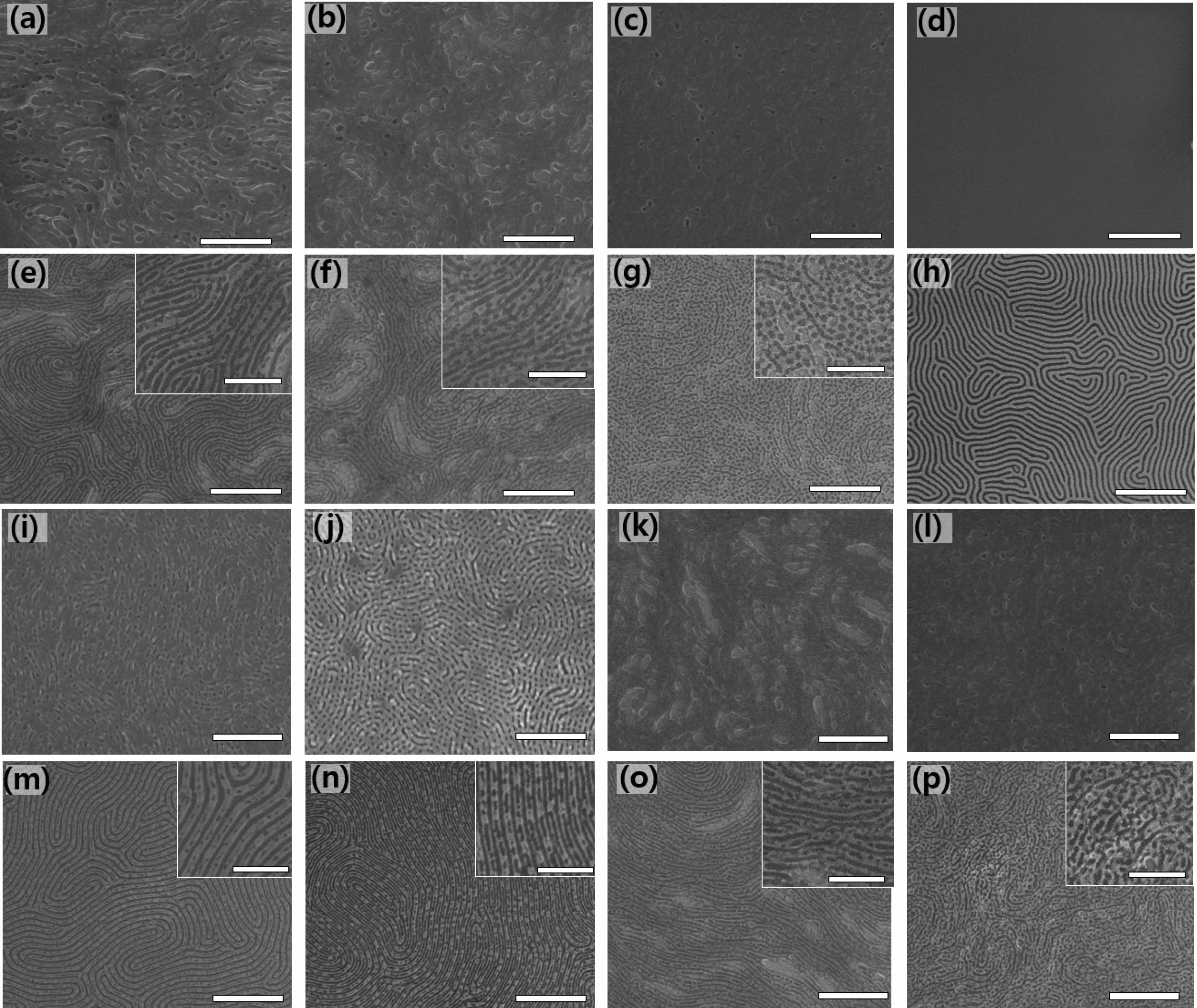 Figure 2 SEM images of (a~d), (i~l) after selective swelling in n-hexane for (a) 30 s; (b) 1 min; (c) 5 min; (d) in n-dodecane for 90 min, and in n-heptane for (i) 30 s; (j) 1 min; (k) 5 min; (l) 20 min. SEM images of (e)~(h) and (m)~(p) show PDMS micro phase after RIE of the samples shown on the upper panels. Scale bars in main panels are 500 nm and in insets are 200 nm. |