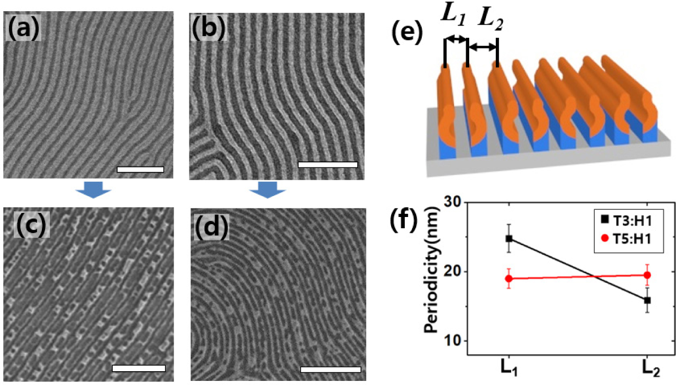 Figure 3 PDMS cylinders and splitted cylinders solvent annealed in (a) and (c) 3:1; (b) and (d) 5:1 of toluene and heptane mixture. (e) Schematic description of two periodicities L1, L2. (f) variation of L1, L2 at each annealing conditons. Scale bars are 200 nm. |