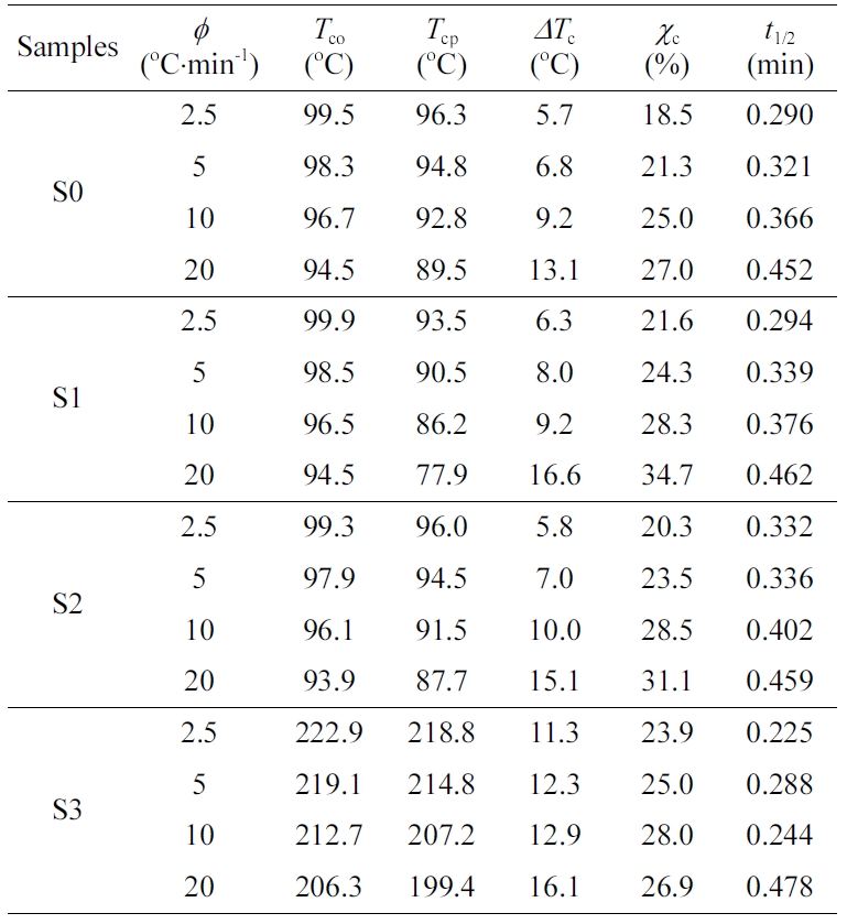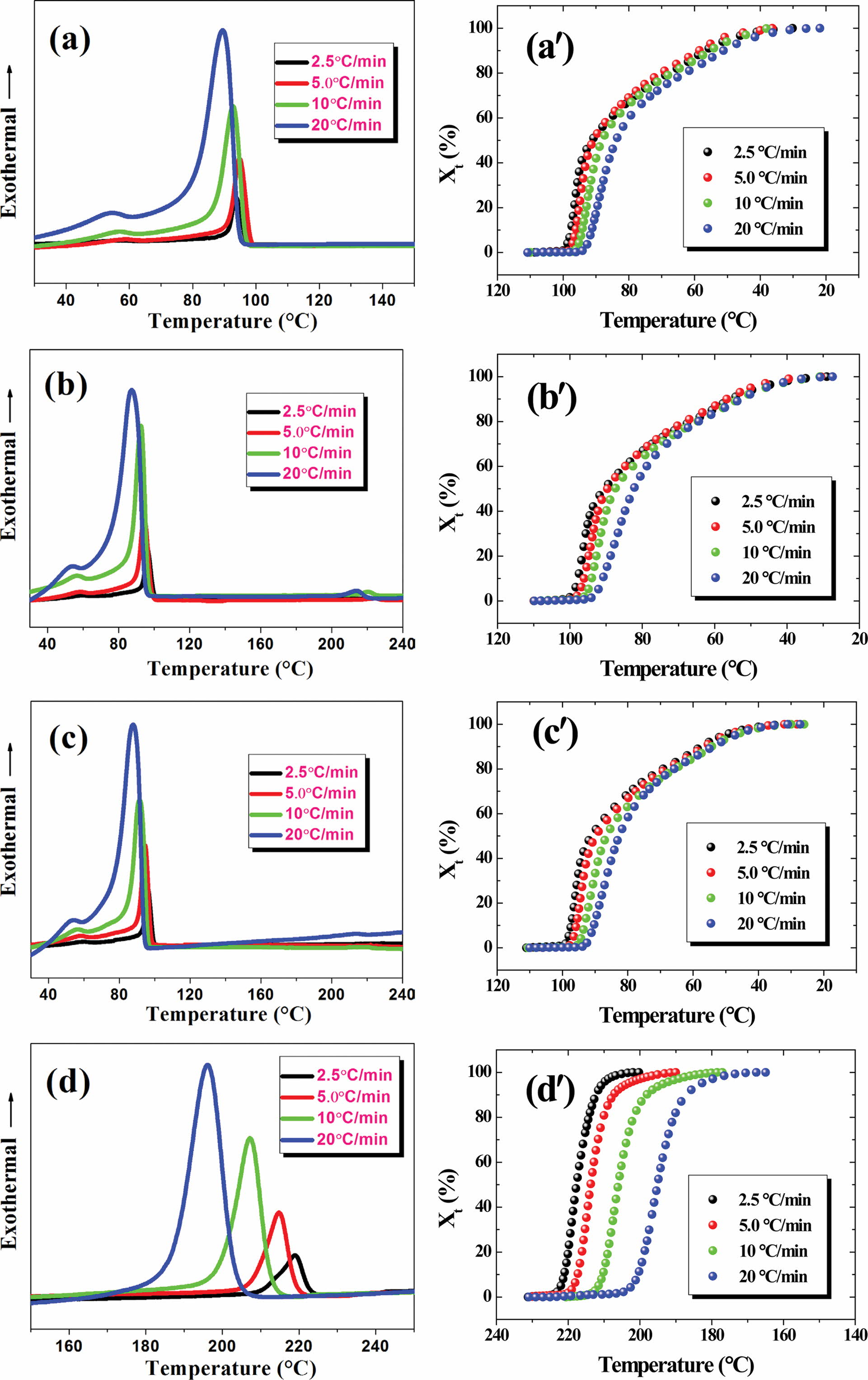 Figure 4 DSC exothermal curves of various samples measured at different cooling rates (a-d); the temperature dependence of relative crystallinity for various samples at different cooling rates (a'-d'). |