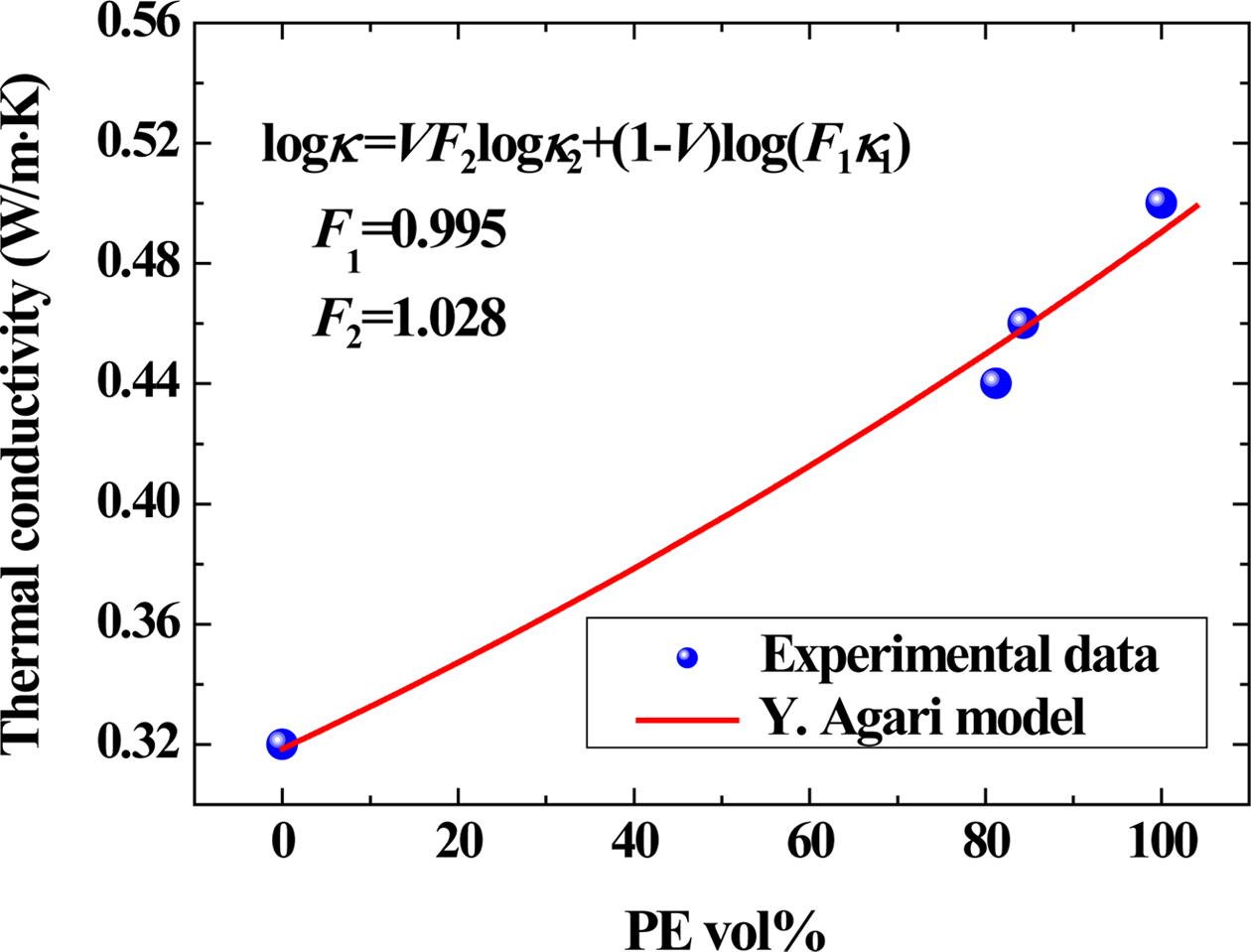 Figure 7 Correlation between thermal conductivity and PE loading as well as the fitting curve using Agari model. |