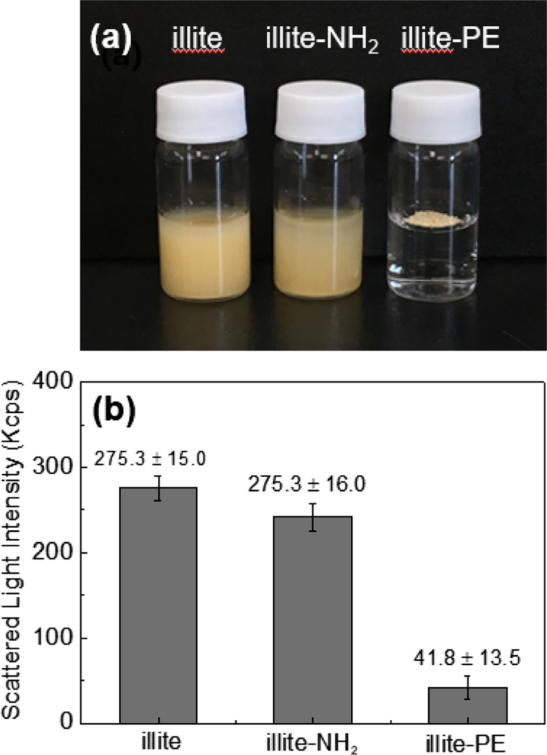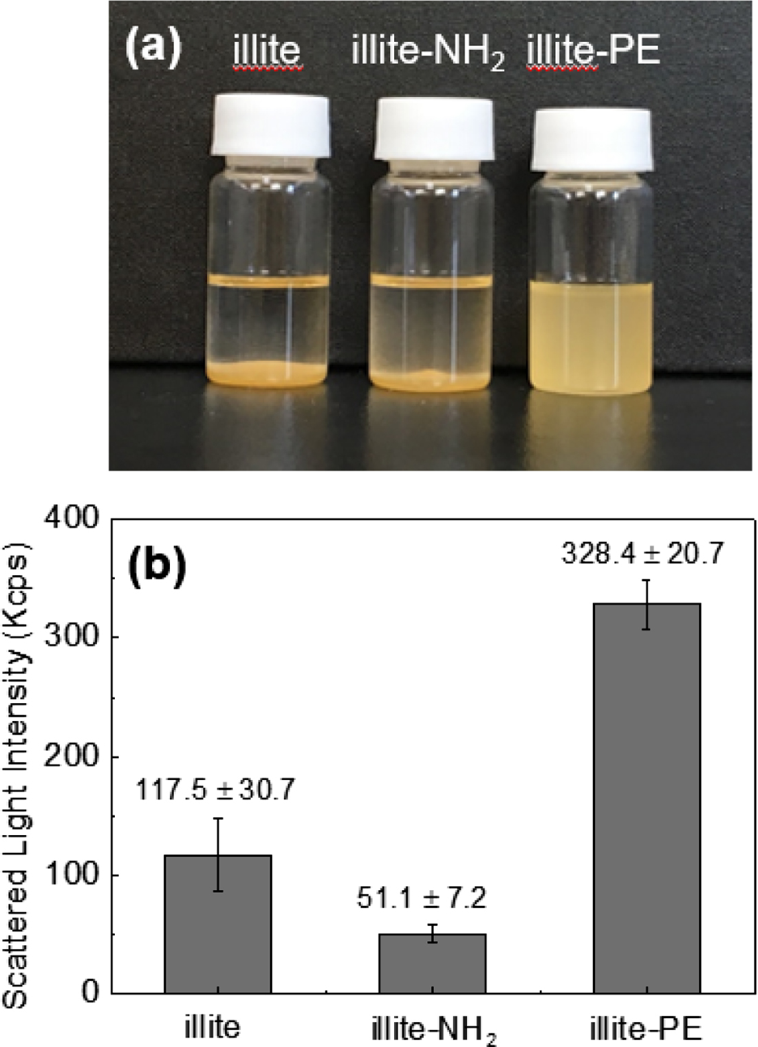 Figure 7 (a) Dispersion behaviors; (b) scattered light intensities of illite, illite-NH2, and illite-PE in the aqueous phase. |