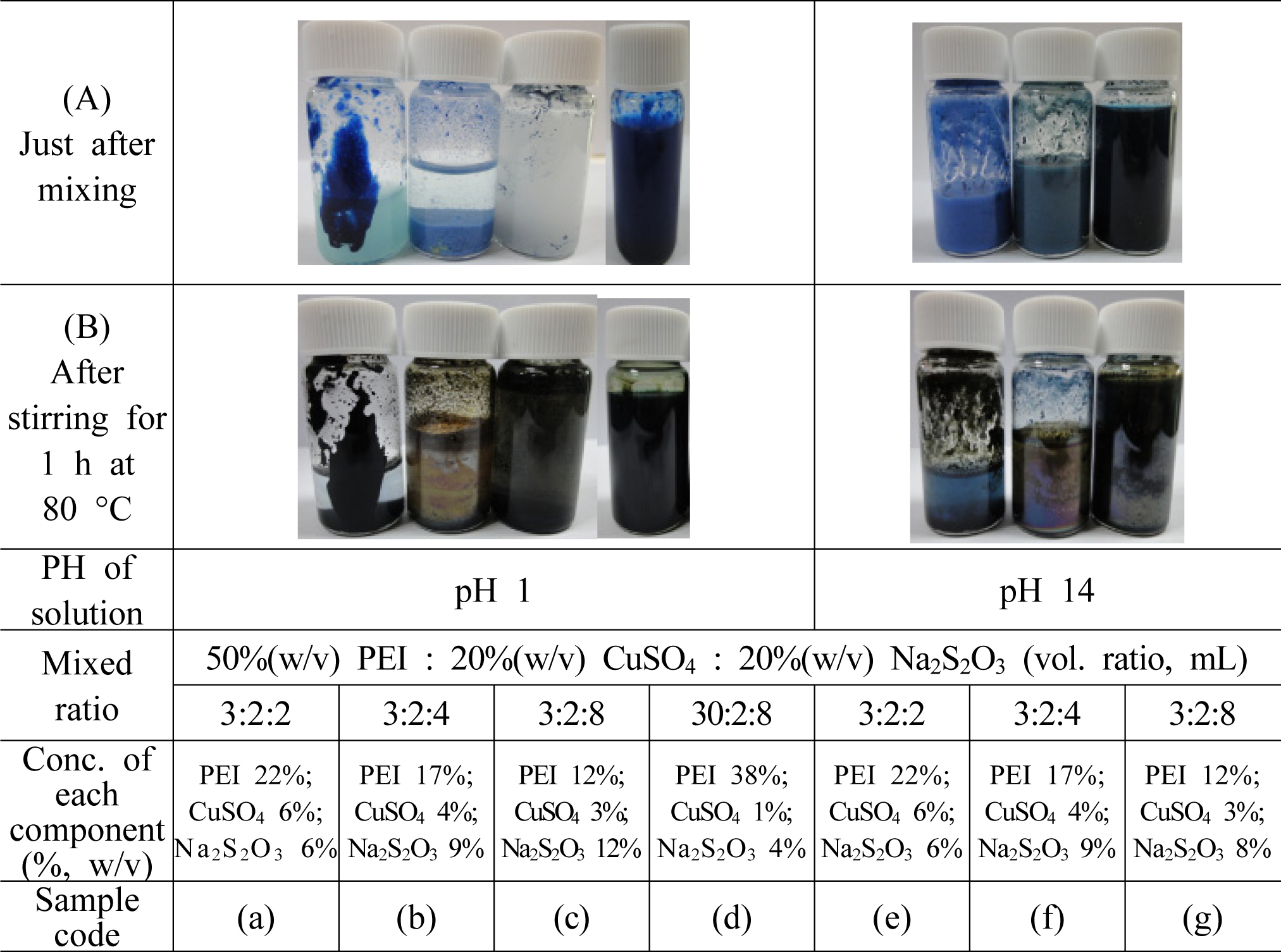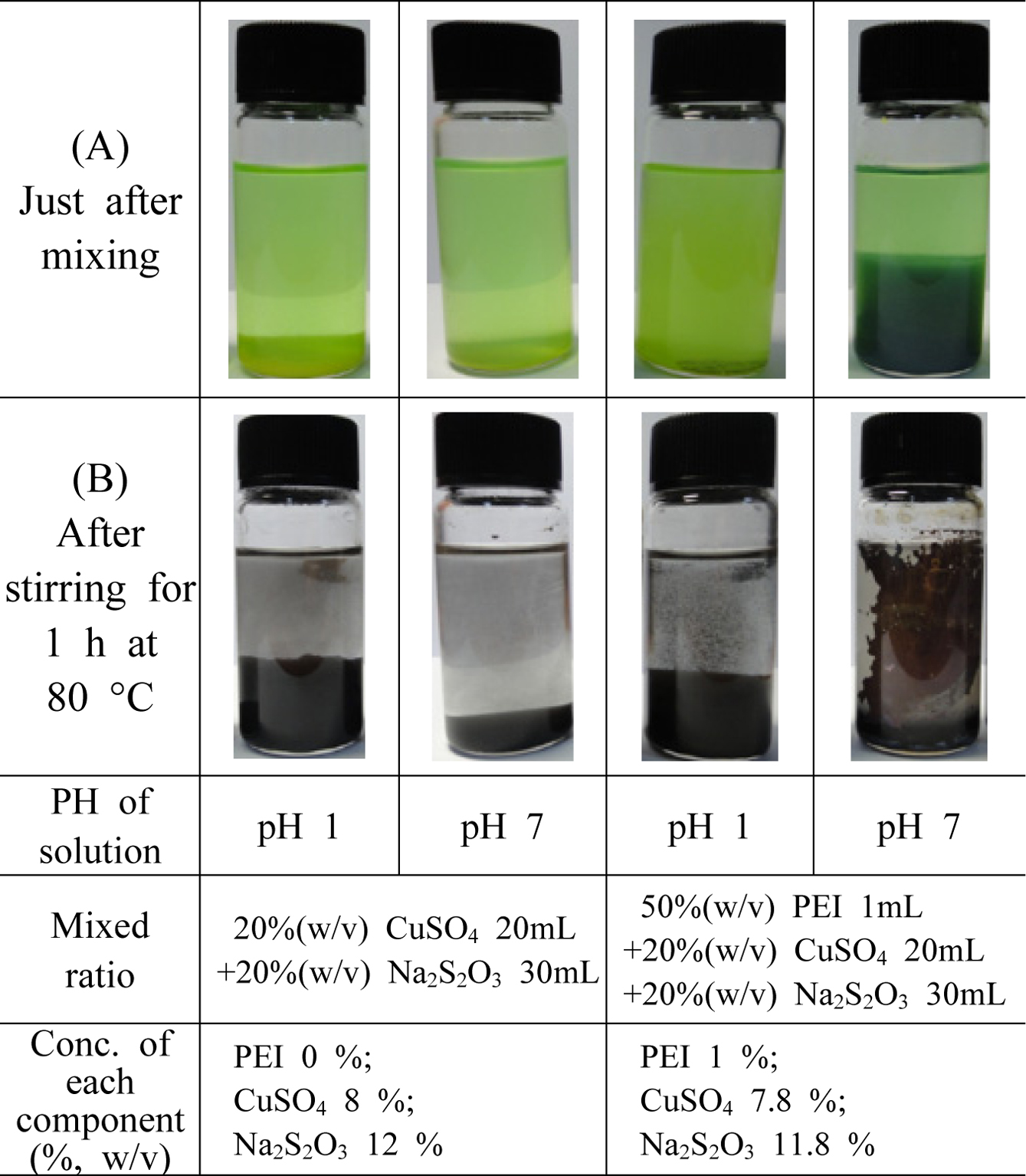 PEI를 전처리하여 아민기를 부여한 후, 여기에 황산구리(CuSO4)와 티오황산나트륨(Na2S2O3)을