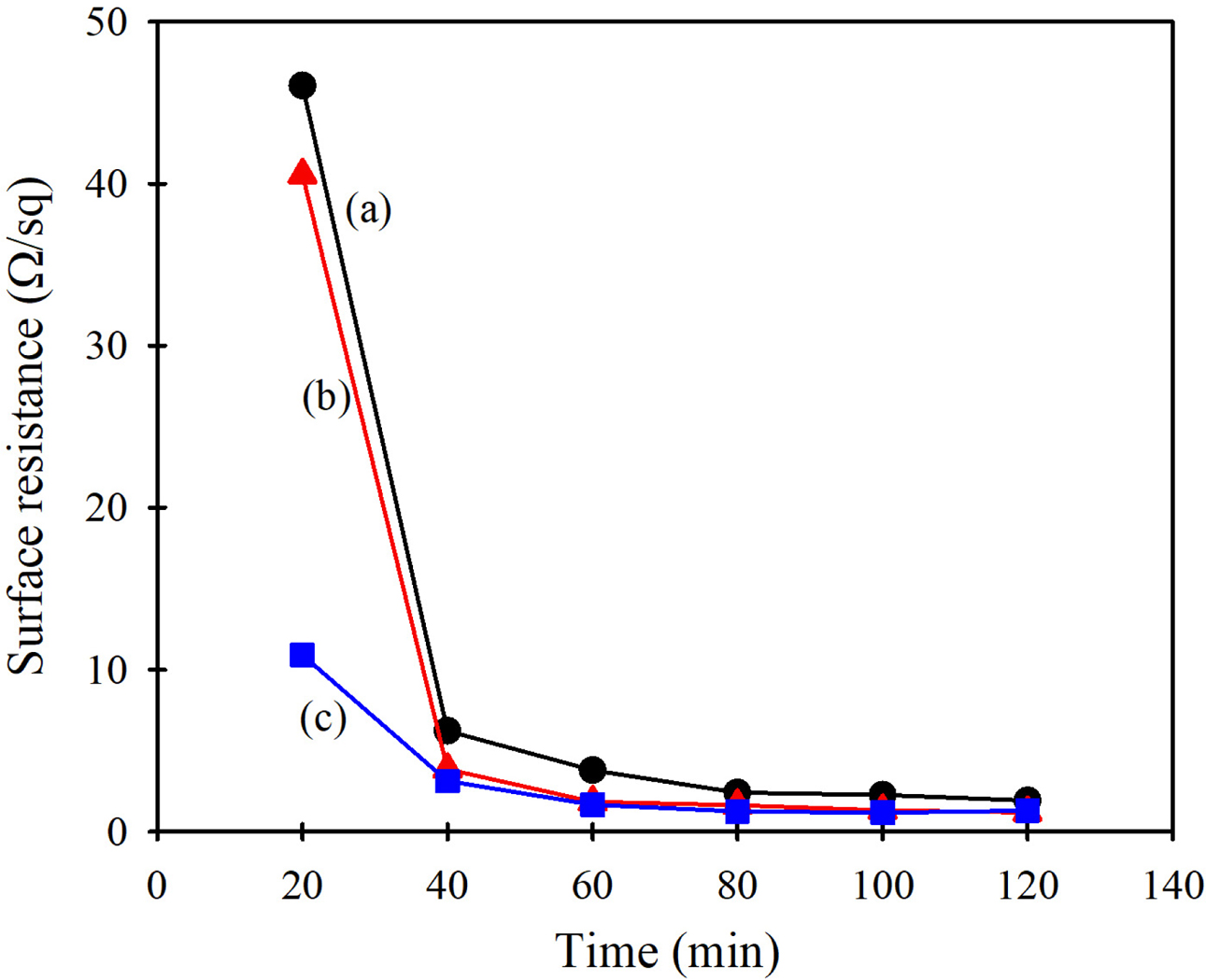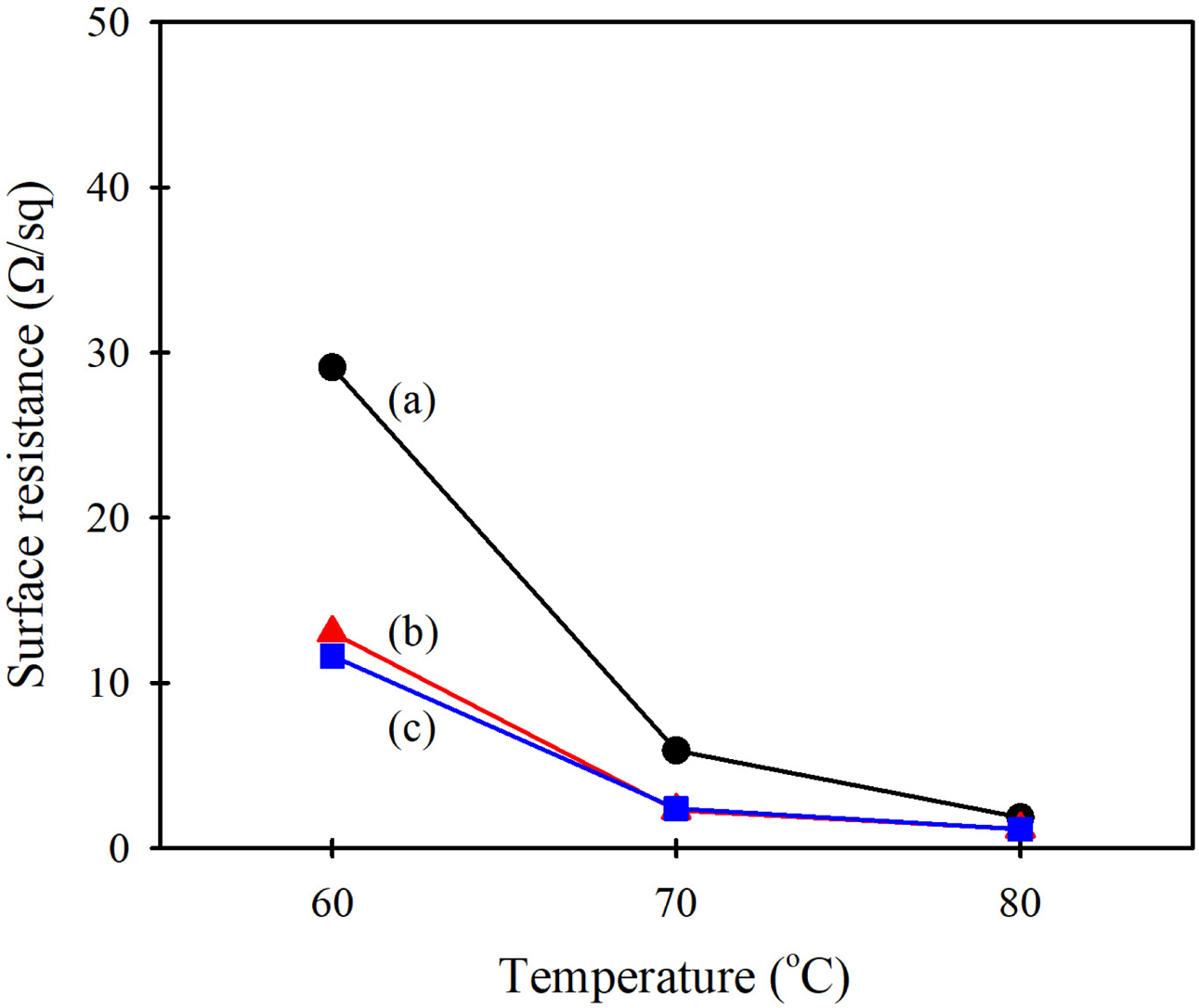 전처리한 시료는 0.5~1.5 Ω/sq 정도의 표면저항 값을 나타내었다. 전체적으로 볼 때 작은 차이이기는 하지만, 전처리 시 사용한
