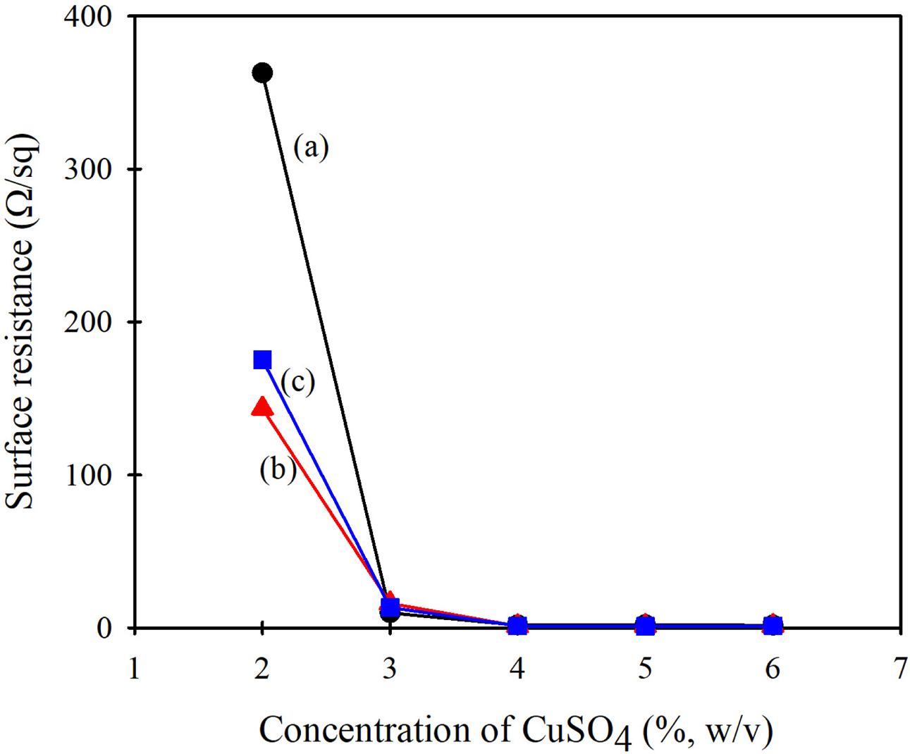 0.5% 정도로 매우 작게 하더라도 황화구리 생성량이 많아지면 모두 표면저항이 1~2 Ω/sq로 크게 감소하며, 전기전도성 면직물을 제조하는데