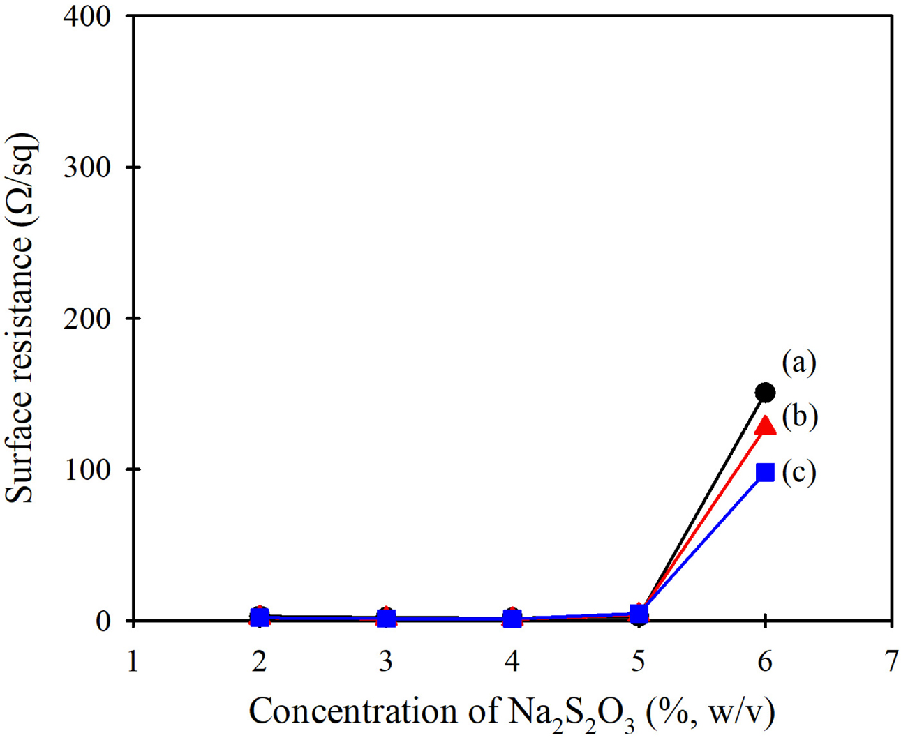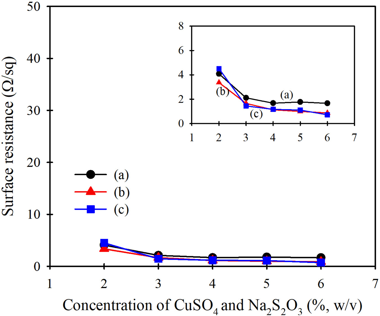 작아지는 것이다. 황산구리의 농도를 4%(w/v)로 한 경우 티오황산나트륨의 농도도 4%(w/v)일 때 거의 일정한 표면저항 값에 도달하였다.