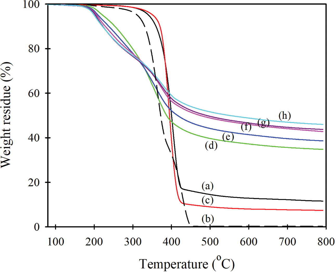 Figure 8 TGA curves of (a) cotton; (b) PEI; (c) 0.1% PEI-treated cotton; (d-f) PEI(0.1%)-pretreated cotton fabrics plated at 80 °C for 2 h with various plating solutions. Concentration of both CuSO4 and Na2S2O3 (1:1) of plating solution (%) : (d) 2; (e) 3; (f) 4; (g) 5; (h) 6. |