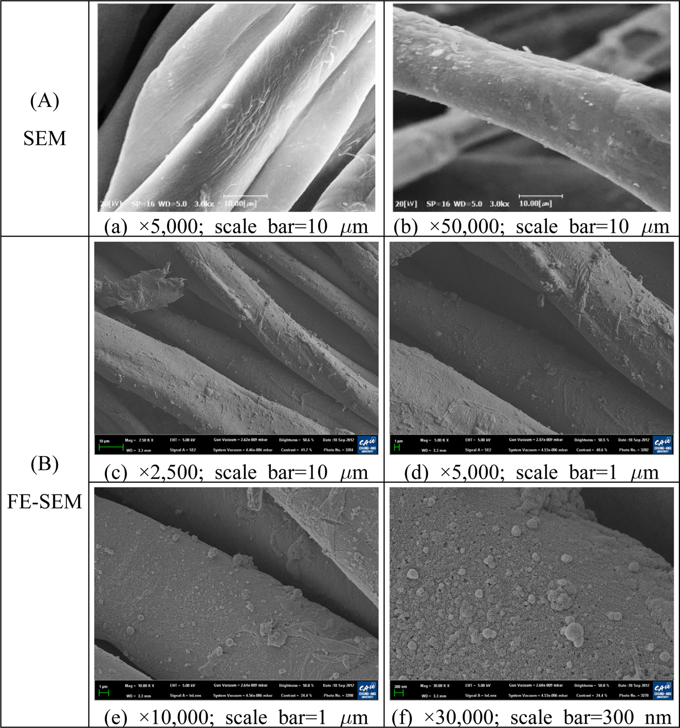 Figure 9 (A) SEM images of (a) untreated cotton; (b) cotton pretreated with 0.1% PEI and plated at 80 °C for 2 h with a plating solution of 4% CuSO4 and 4% Na2S2O3.; (B) FE-SEM images of the same sample of (b) with different magnifications. |