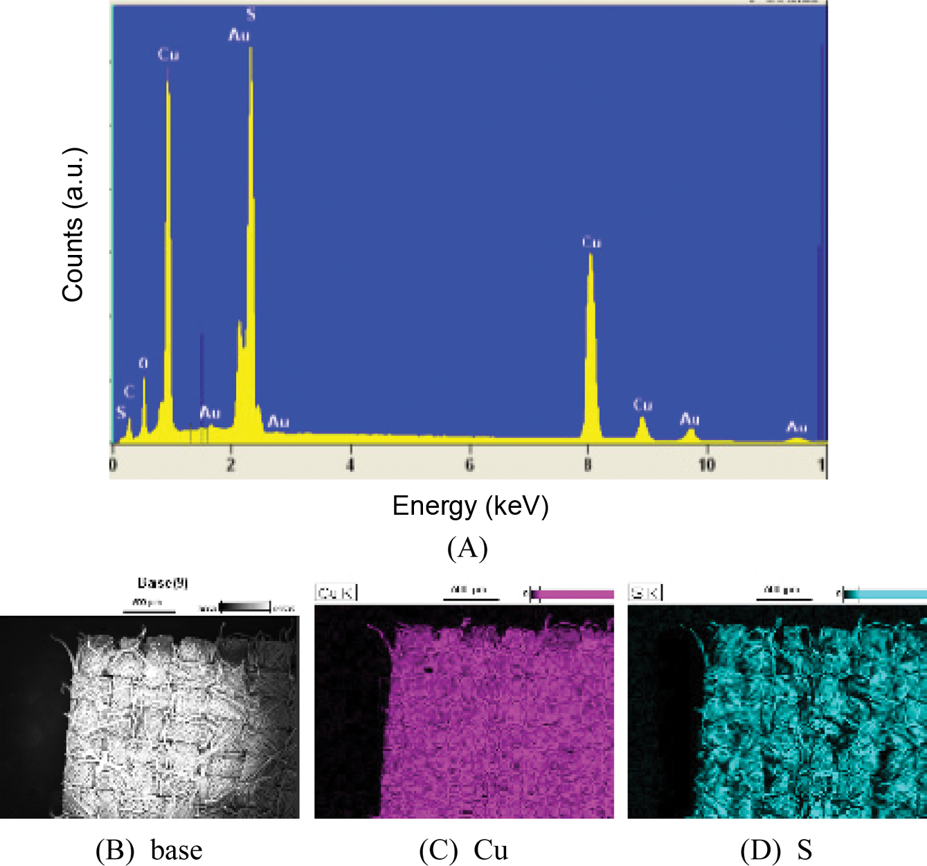 Figure 10 (A) EDS spectrum; mapping images of (B) base; (C) copper; (D) sulfur of the cotton fabric pretreated with 0.1% PEI and plated at 80 °C for 2 h with a plating solution of 4% CuSO4 and 4% Na2S2O3. |