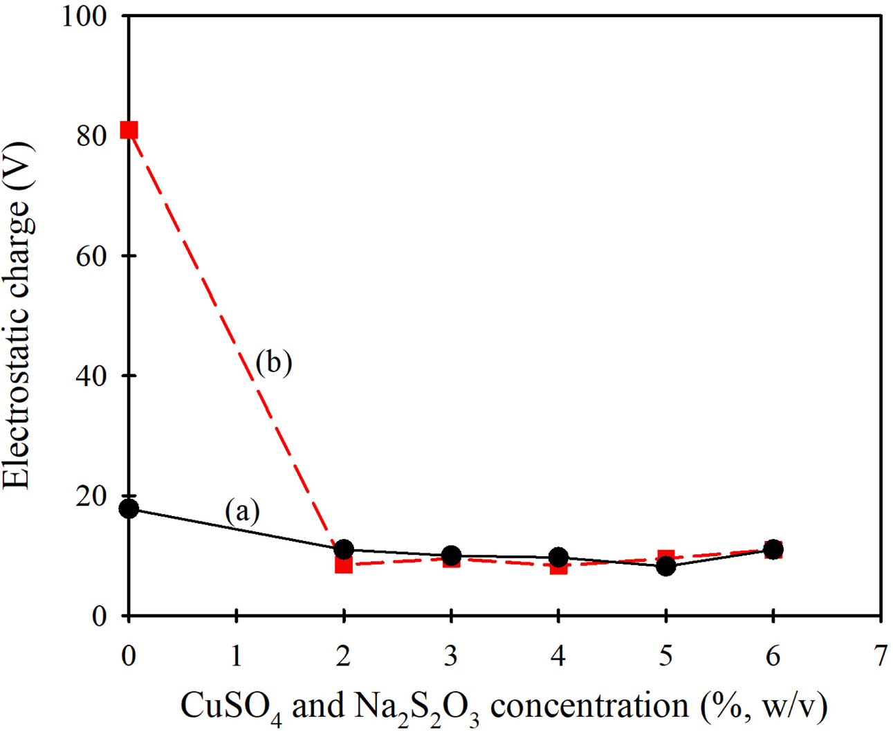 Figure 11 Frictional electrostatic charges of the cotton fabrics pretreated with 0.1% PEI and plated at 80 °C for 2 h with plating solutions of various concentrations of CuSO4 a nd Na2S2O3. Friction fabric; (a) cotton; (b) wool. |