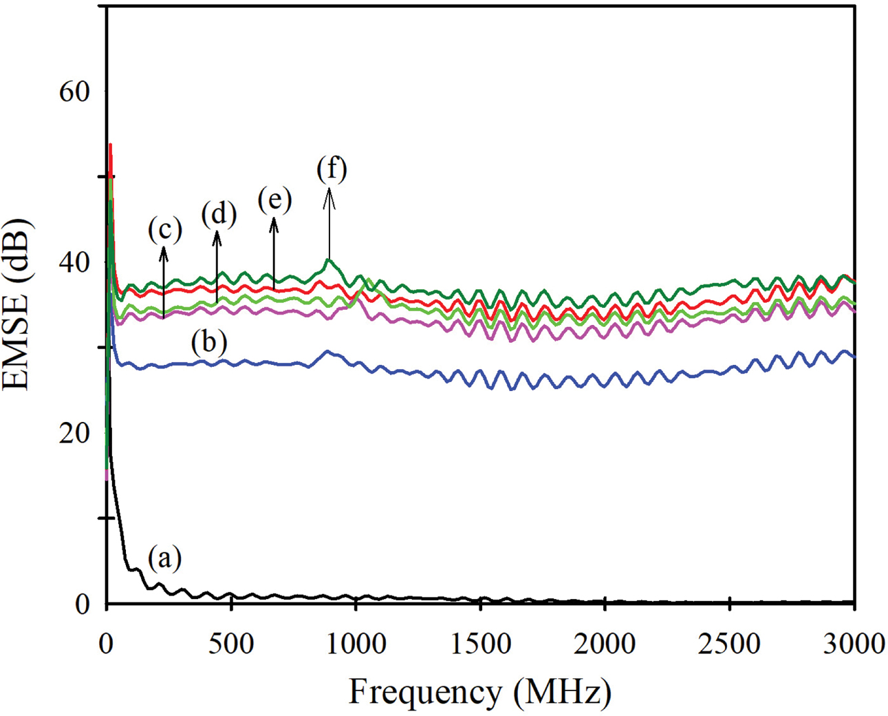 Figure 12 Electromagnetic shielding efficiency (EMSE) of the cotton fabrics pretreated with 0.1% PEI and plated at 80 °C for 2 h with various plating solutions. Concentration of both CuSO4 and Na2S2O3 (1:1) of plating solution (%): (a) un-treated (cotton); (b) 2; (c) 3; (d) 4; (e) 5; (f) 6. |