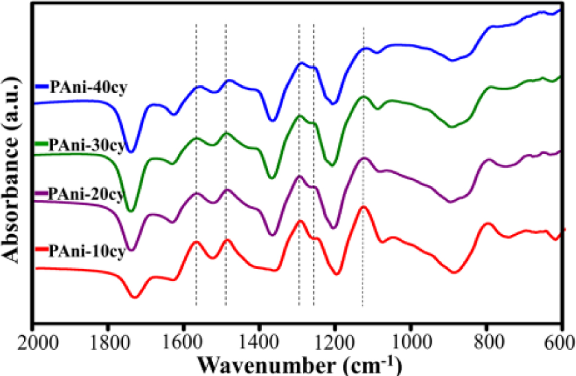 Figure 3 FTIR spectra of PAni obtained for d ifferent cycle numbers (10, 20, 30, and 40). |