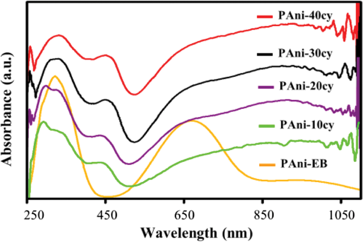 Figure 4 UV-Vis spectra of PAni-EB and PAni obtained for different cycle numbers (10, 20, 30, and 40). |