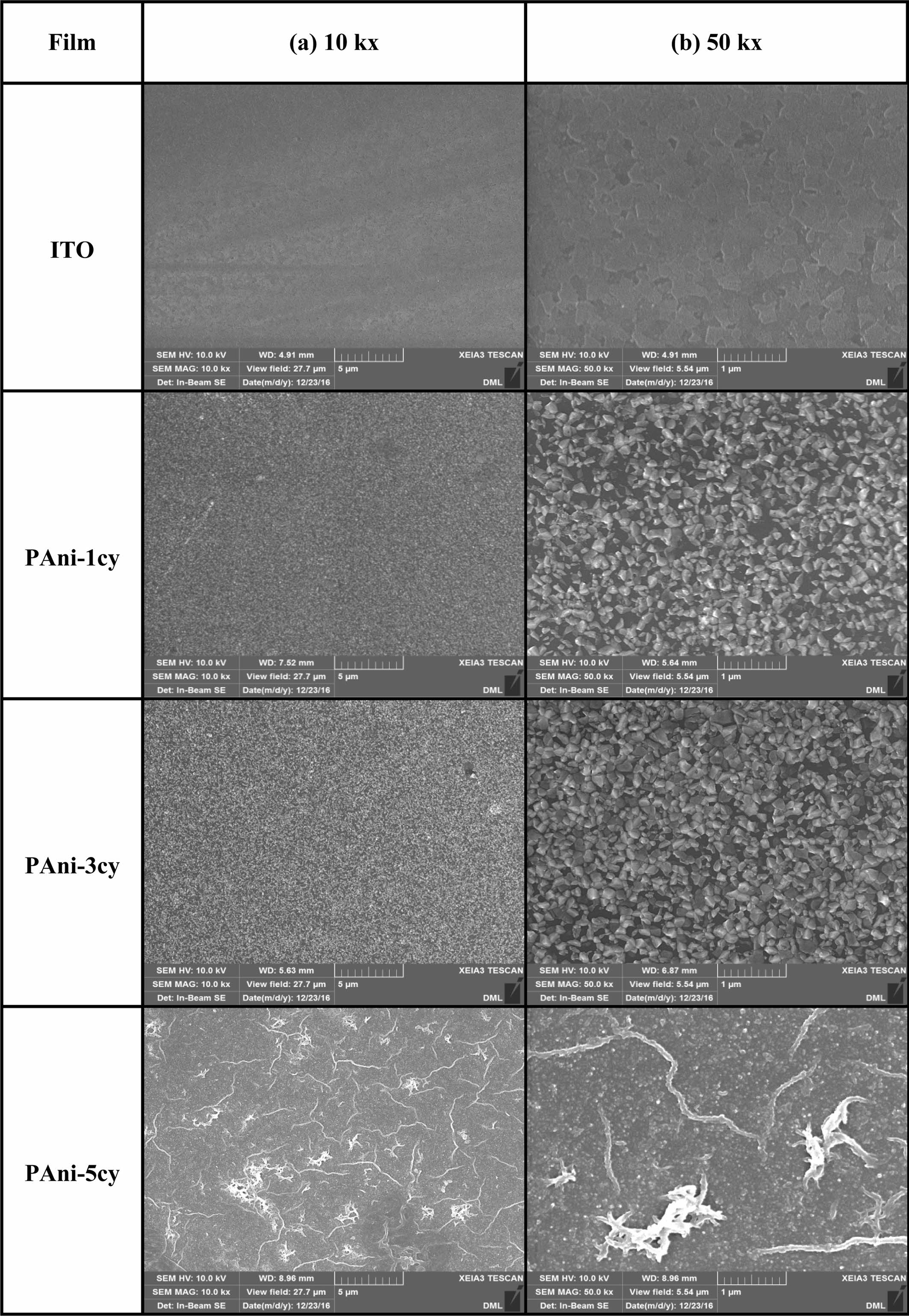 (b) 50 kx. Figure 5 shows SEM images of ITO and PAni obtained at different