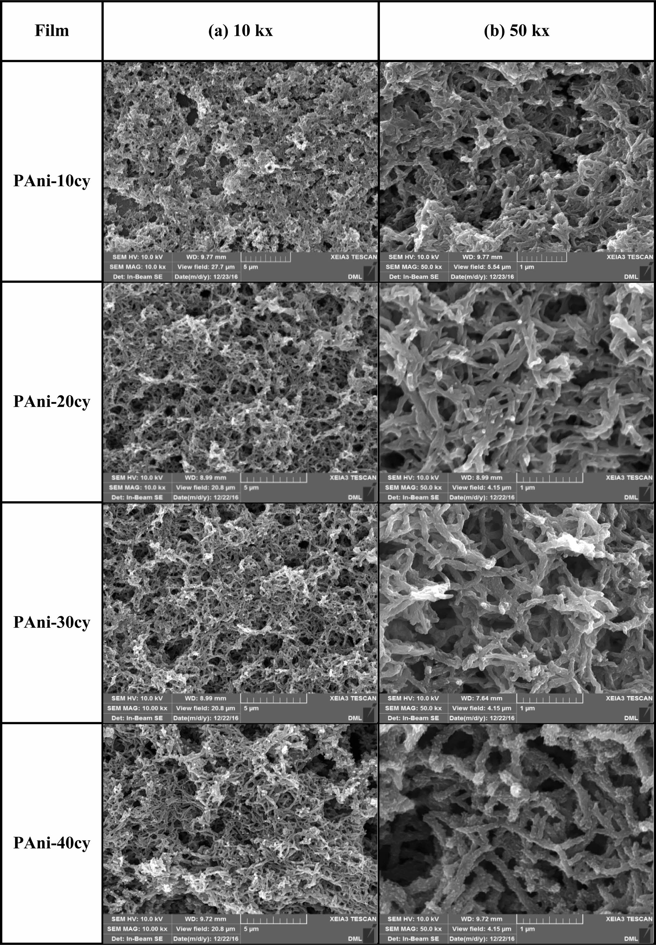 Figure 6 shows SEM images of PAni obtained at different cycles (10, 20, 30, and