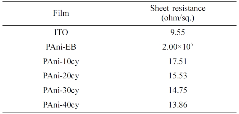 전압전류의 사이클이 증가함에 따라, 필름은 큰 자유 부피를 가지며 더욱 거칠고 다공성인 3차원 네트워크 구조가 되면서 도핑 레벨이 증가되었다. 결국, 증가된 도핑 레벨과 전하 캐리어 이동성의 향상으로 인해 폴리아닐린 필름의 면저항이 낮아졌다.