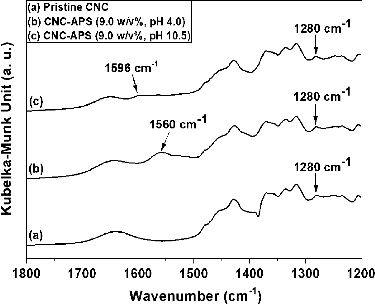 Figure 1 DRIFTS-FTIR spectra with different pH values: (a) pristine CNC; (b) CNC modified with 9.0 w/v% APS at pH 4.0; (c) CNC modi fi ed wi th 9.0 w/v% APS at pH 10.5. |