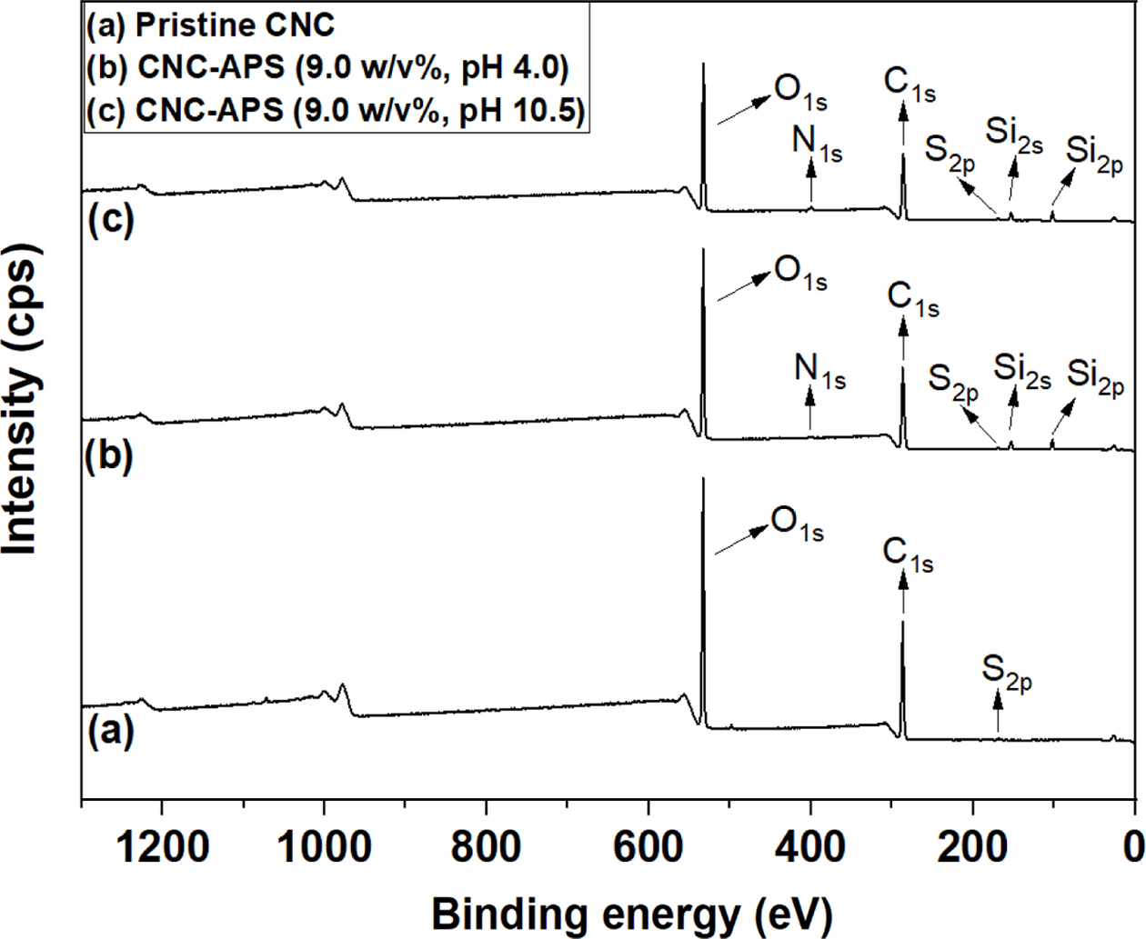 Figure 2 XPS survey spectra of (a) pristine CNC; (b) CNC modified with 9 .0 w/v% APS at pH 4.0; (c) CNC modi fi ed wi th 9 .0 w/v% APS at pH 10.5. |