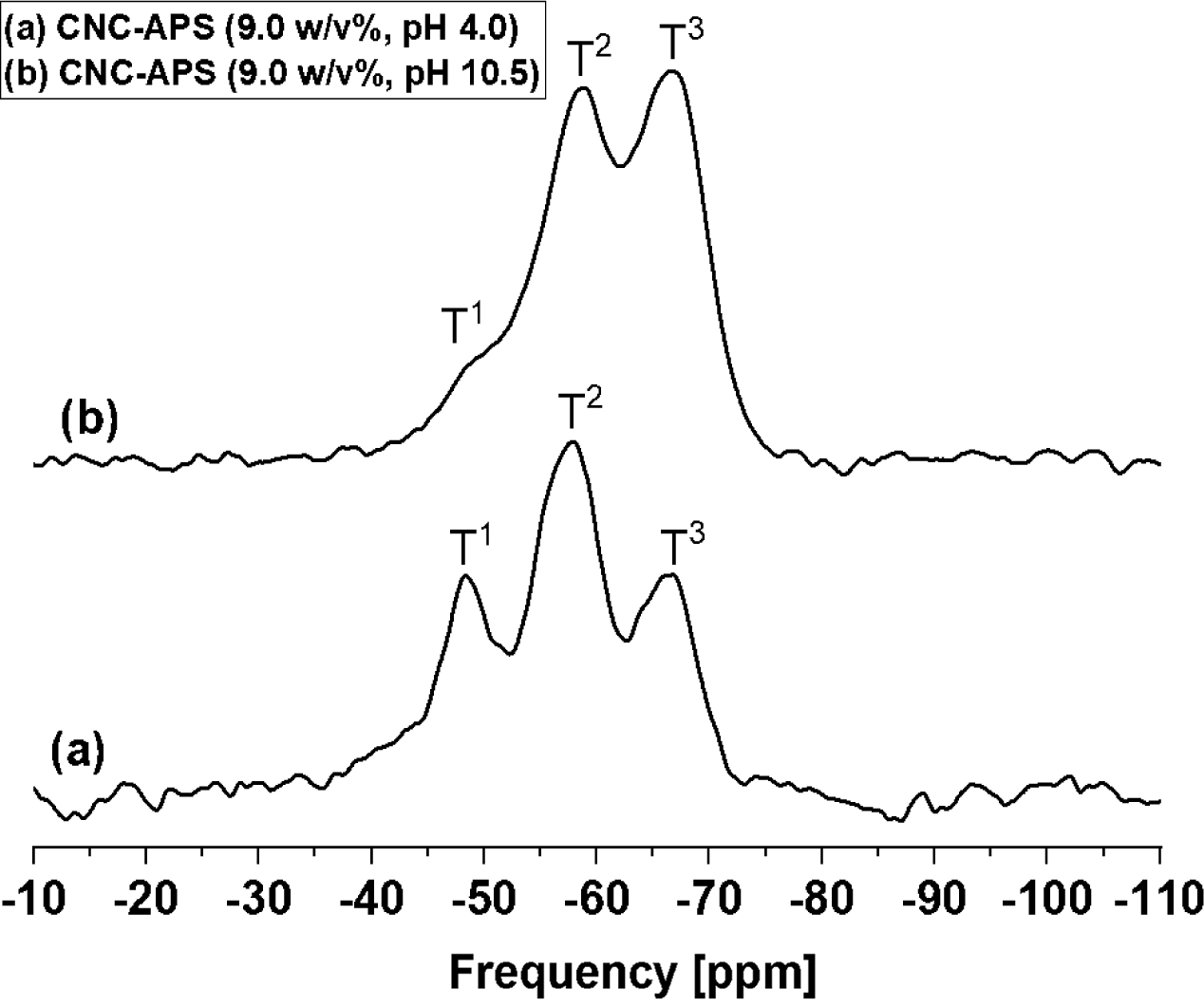 Figure 3 Solid state 29Si NMR spectra of (a) CNC modified with 9.0 w/v% APS at pH 4.0; (b) CNC modified with 9.0 w/v% APS at pH 10.5. |