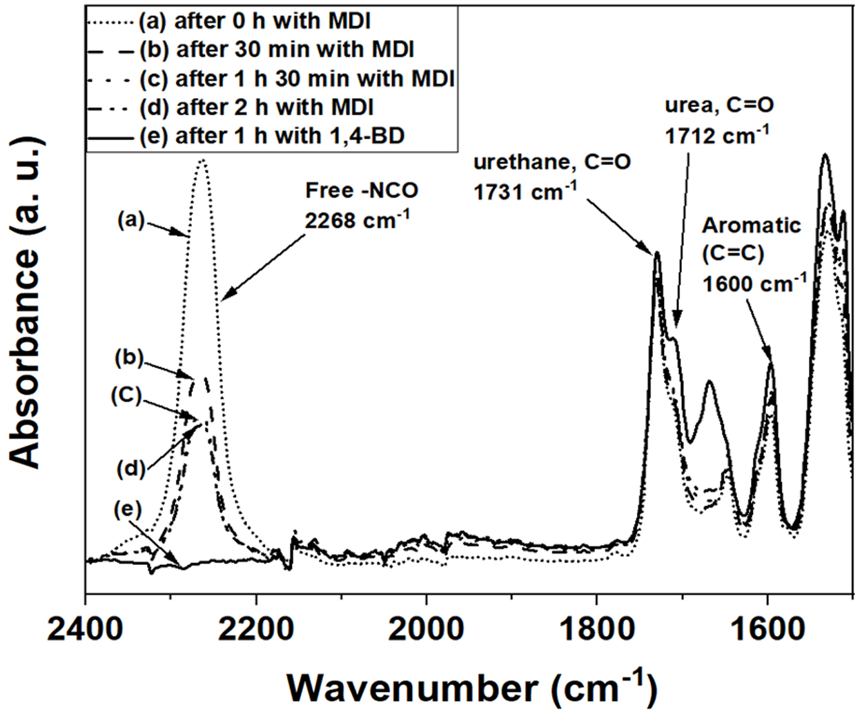 과량의 MDI와 반응시켜 양 쪽 말단에 -NCO기를 가지는 예비중합체(prepolymer)를 제조하였다. 그 후, 사슬연장제인 1,4-butanediol (1,4-BD)을 -NCO/OH 비가 1.1:1이 되도록