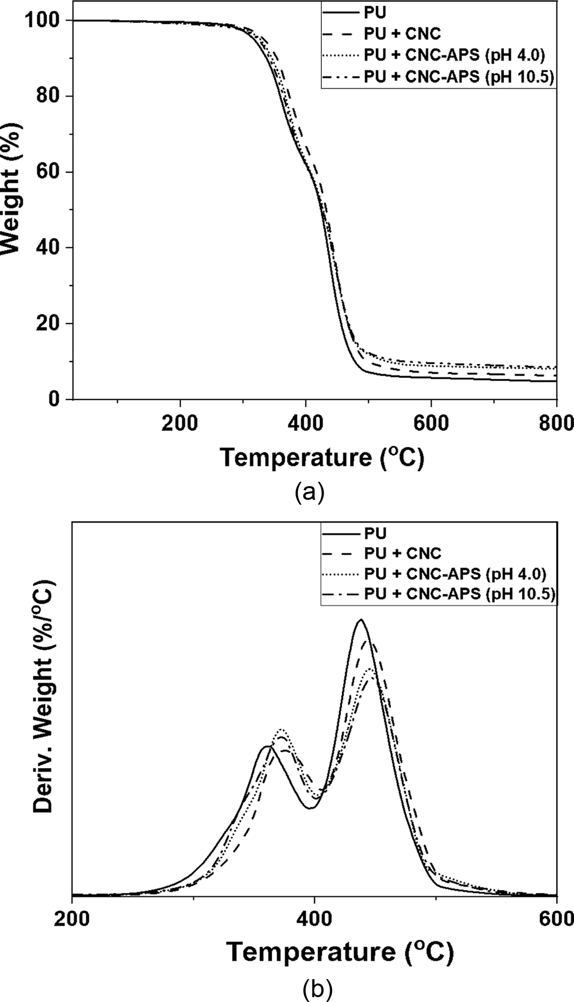 및 CNC와 CNC-APS 1.0 wt%를 충전제로 사용한 PU 나노복합체의 열적 특성을