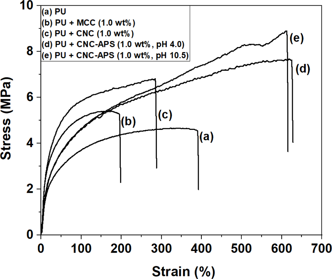 Figure 6 Stress-strain curves of (a) PU; (b) PU with 1.0 wt% MCC; (c) PU wi th 1 .0 wt% CNC; (d) PU with 1 .0 wt% CNC-APS (pH 4.0); (e) PU with 1.0 wt% CNC-APS (pH 10.5). |