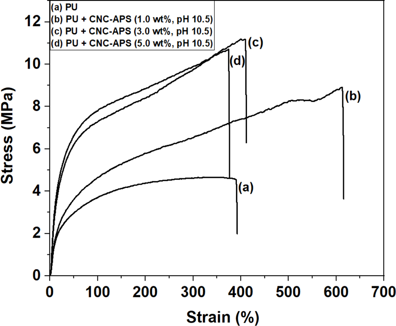 Figure 7 Stress-strain curves of (a) PU; (b) PU with 1.0 wt% CNCAPS (pH 10.5); (c) PU with 3.0 wt% CNC-APS (pH 10.5); (d) PU wi th 5.0 wt% CNC-APS (pH 10.5). |