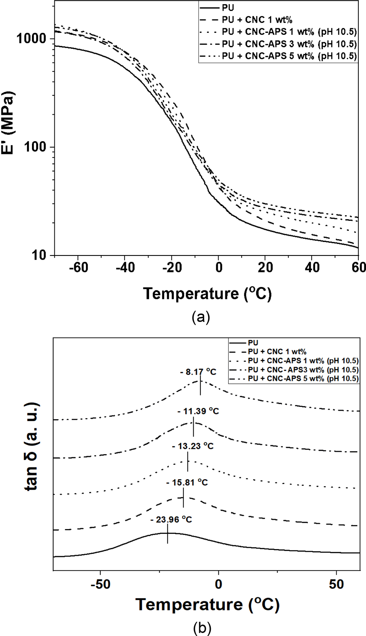 wt%, CNC-APS 1.0, 3.0 및 5.0 wt%를 충전제로 사용한 PU 나노복합체의 -70 oC에서의 유리영역의 E′는 1187, 1331, 1173 및 1290 MPa로 측정되었고,