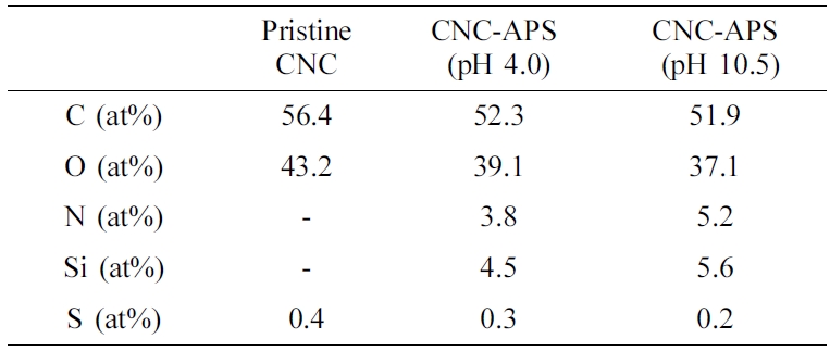 개질된 CNC에서는 나타나는 것을 확인하였다. 또한 EA 및 XPS를 사용하여 순수 CNC에서는 관찰되지 않던 N과 Si 원소가 개질된