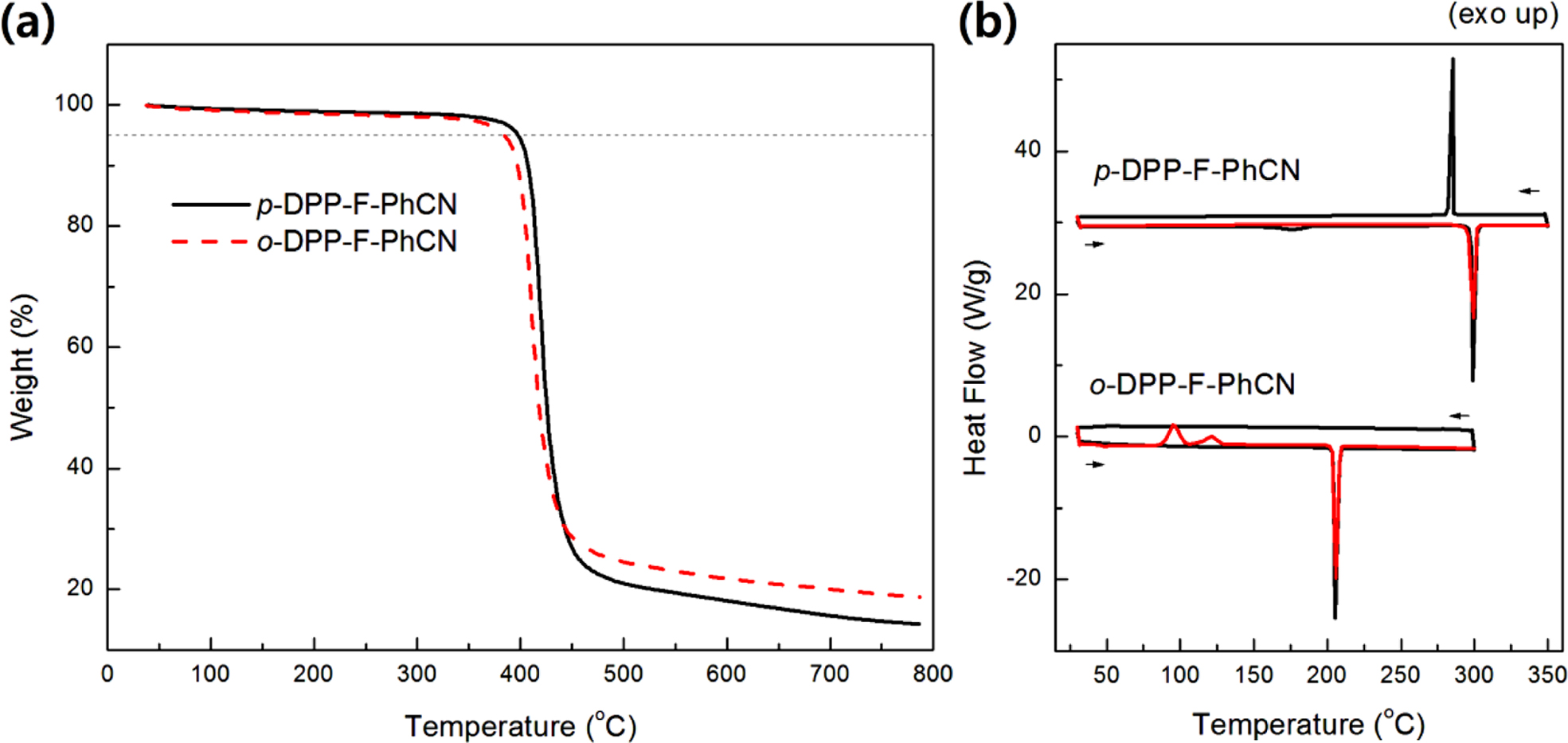 Figure 1 (a) TGA; (b) DSC curves of DPP-F-PhCNs. |
