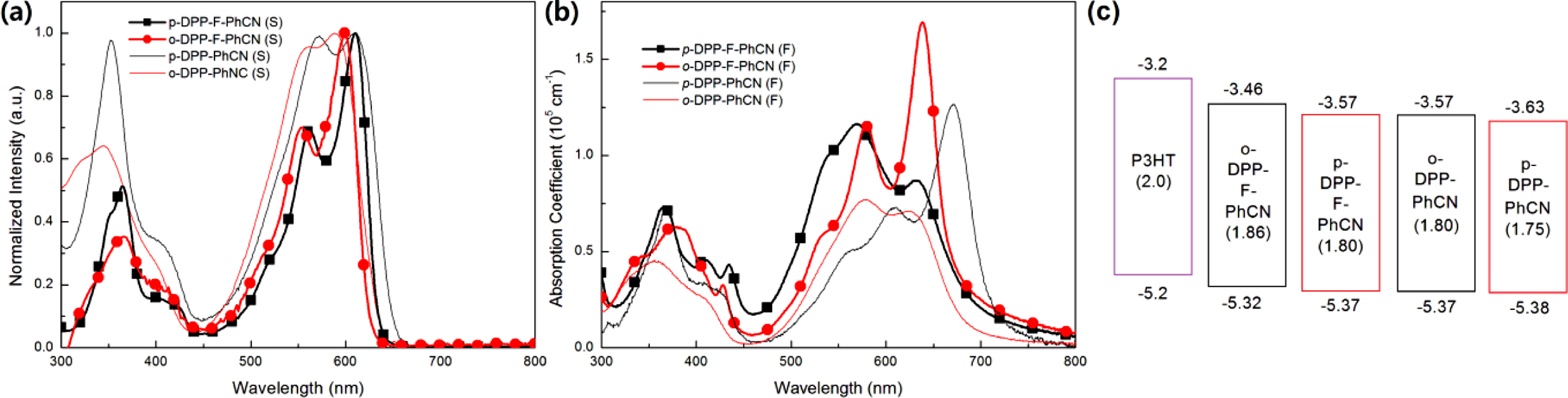 Figure 2(c) compares the energy levels of DPP-F-PhCNs with those of the