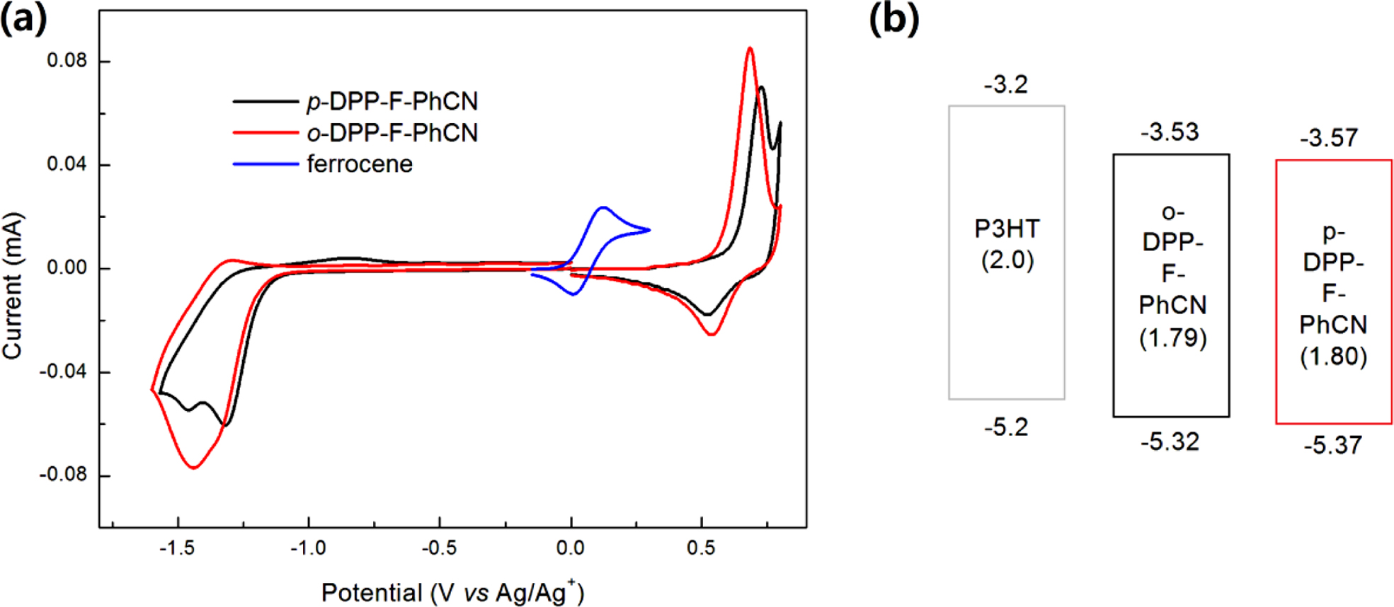 energy levels for p-DPP-F-PhCN (−5.37/−3.57 eV) relative to those of o-DPP-F-PhCN
