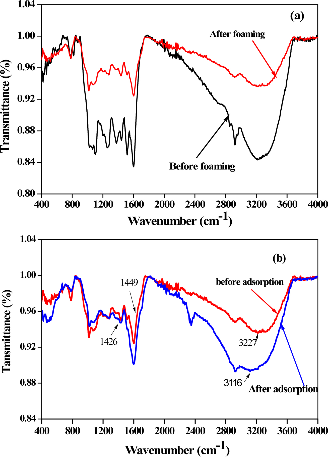 FTIR spectra (a) pinus tannin before and after foaming reaction; (b) APTF material before and after adsorption.