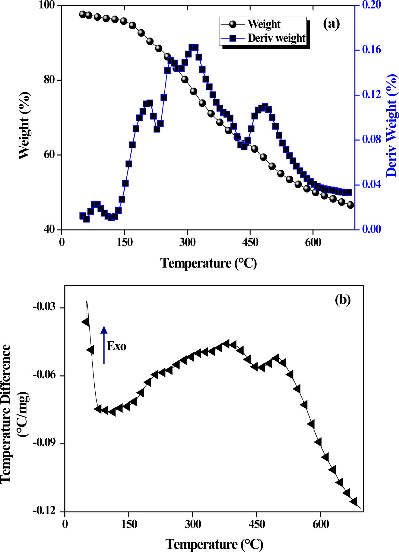 The thermal analysis was performed on TA instrument (TGA Q50 instrument). The temperature run covered the range from 25 to 600 °C at a heating rate of 10 °C/min under air flow of 40 mL/min.