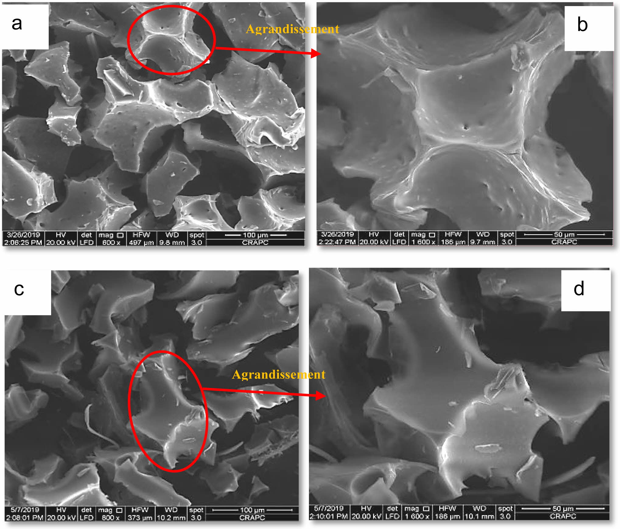 The imaging with SEM was done to identify the morphological features of the adsorbent surface specially any change occurred on the APTF after Cr(VI) adsorption (Figure 3). It is initially clear that the material exhibits porosity in the form of cavities, which have been most likely resulting by the presence of the foaming agent during the foaming stage (Figure 3(a) and 3(b)). After adsorption of the chromium ions, the surface of APTF became smoother and encountered overlap due to Cr(VI) adsorption (Figure 3(c) and 3(d)).