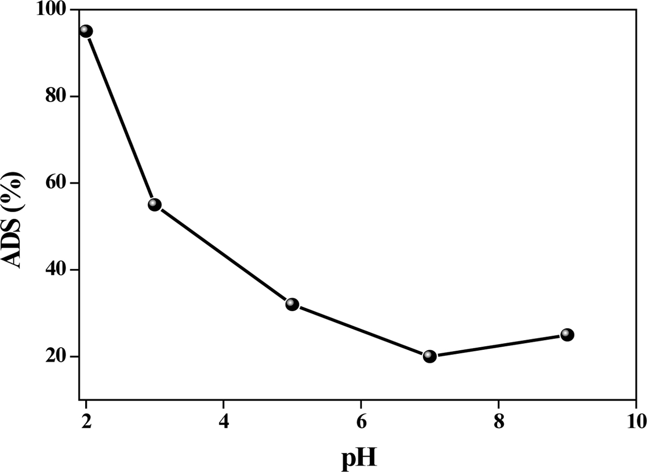 It is apparent that the increase of the adsorbent dose was associated by elevation of the Cr(VI) adsorption level from 30% for 0.01 g to 95% for 0.2 g. This upturn is surely ascribed to the availability of larger number of adsorption sites by increasing the adsorbent dose.27 In brief, the best possible adsorption efficiency was almost 85% and accomplished using 0.04 g of the adsorbent per 100 mL aqueous solution (0.4 g/L) for initial concentration dose 100 mg/L of Cr(VI).