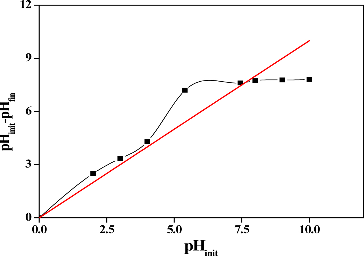 The point of zero charge of APTF (PZC) is the pH of the aqueous solution in which the solid exists under neutral electric potential, which can be identified using the experimental protocol described by Lopez-Ramon et al.19 Flasks of NaCl solutions (0.1 M) with pH values between 2 and 10, normally adjusted with 0.01 M solutions of HCl or NaOH, were prepared. 0.5 g of the adsorbent was mixed with 20 mL of each solution separately and stirred for 48 h before filtration. The pH values of the resulting solutions were then recorded and plotted as a function of the initial pH for each solution. The PZC corresponds to the pH of the solution at which the lines meet at the common point of intersection.