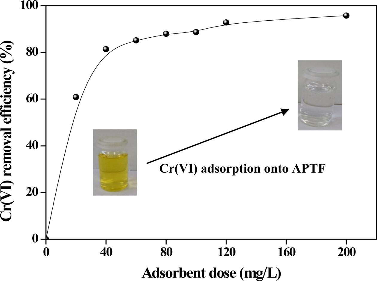 Effect of Adsorbent Dose. The impact of the adsorbent dose on the removal efficiency of Cr(VI) from aqueous solution was explored by conducting several experiments using 100 mL solutions of Cr(VI) at initial concentration of 100 mg/L, at which different APTF amounts were charged at a temperature of 20±1 °C and a stirring rate of 120 rpm while the contact time was 2 h and the corresponding results are revealed in Figure 6. First of all, the elimination of Cr(VI) was fast in the beginning of the adsorption process then the increase became slower until reaching a leveling off state.
