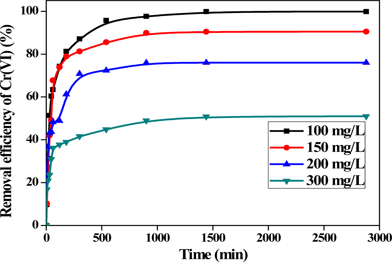 Effect of Initial Cr(VI) Concentration. It is imperative that the high initial Cr(VI) presents a significant driving force to overcome the mass transfer resistance of ions moving from aqueous solution to a solid phase (adsorbent). This parameter was studied by formulating several Cr(VI) concentrations in the range from 100 to 300 mg/L while the APTF dose was kept unchanged. The development of chromium ions adsorption onto APTF as a function of time is illustrated in Figure 7. It can be dictated from Figure 7 that three phases are representing the mass transfer of Cr(VI) onto APTF. The first region is related to the external mass transfer effect. This is due to the initial availability of the free sites and the higher concentration of Cr(VI) ions, which provides strength to the ions to diffuse through the solution to the surface of the adsorbent. Then, the second region appears as expected to encounter a low adsorption rate as a result of the gradual decrease in the number of adsorption sites. Eventually, the third region is attributed to the low concentration gradient when the adsorption sites accomplished saturation thereby it remained constant. In our case, the adsorption was realized after 5 h and remained stable even after 48 h.