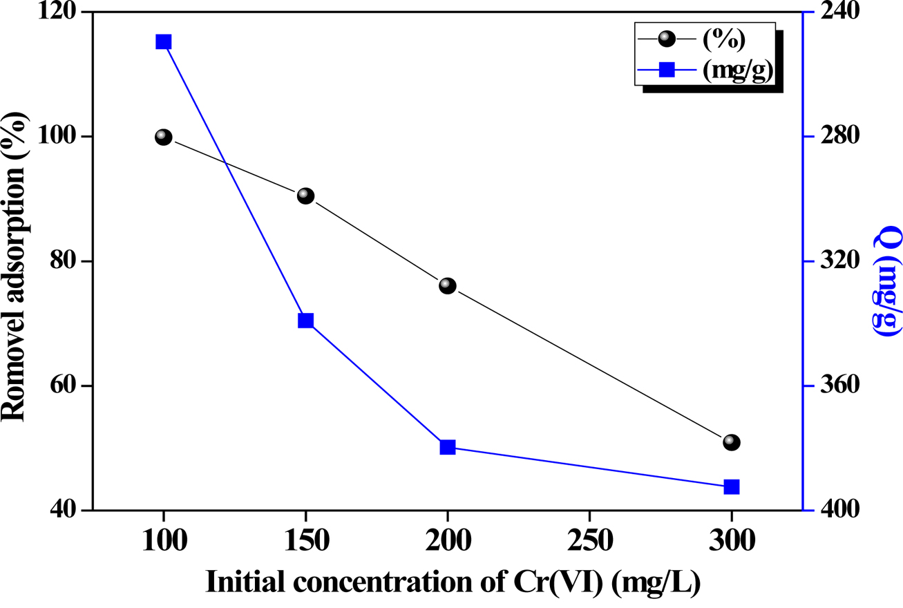 Variation of adsorption capacity and removal efficiency as a function of the initial Cr(VI) concentration.