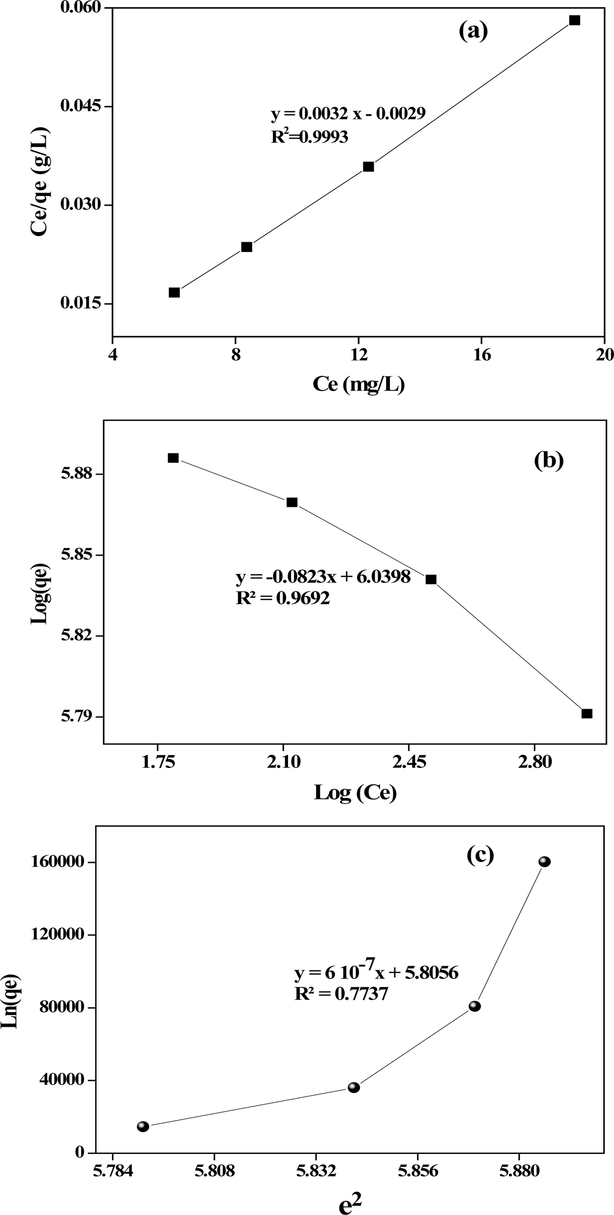 Adsorption isotherm profiles: (a) Langmuir; (b) Freundlich; (c) Dubinin-Radushkevich.