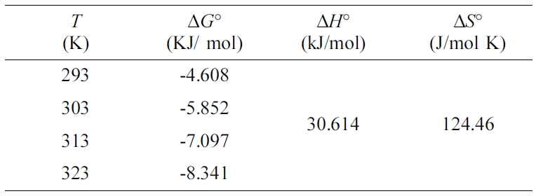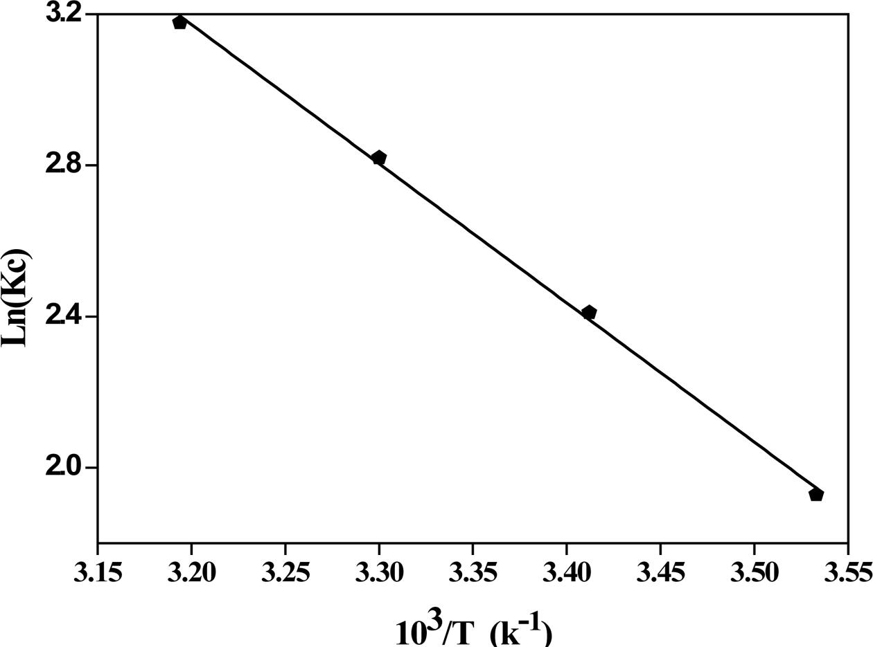 Where Kc is the equilibrium constant, Ce and C0 are the equilibrium and initial concentrations for Cr(VI) adsorption on APTF (mg/L), respectively, R is a universal gas constant (8.314 J/K mol) and T is the absolute temperature (K).