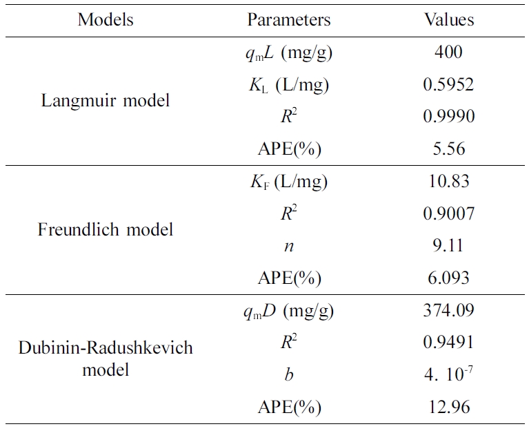 Adsorption Isotherm. The study of adsorption isotherm provides a good tool to explain the interaction of the adsorbate with the surface of the adsorbent. In this study, three isotherm models are investigated for this purpose; Langmuir, Freundlich and Dubinin-Radushkevich.28 We focus in this study on two parameters in order to identify the most suitable isotherm that fits well to the relation between the adsorbate and adsorbent based on the correlation coefficient (R2) and the APE means (%). The correlation coefficient R2 is described by eq. (3):