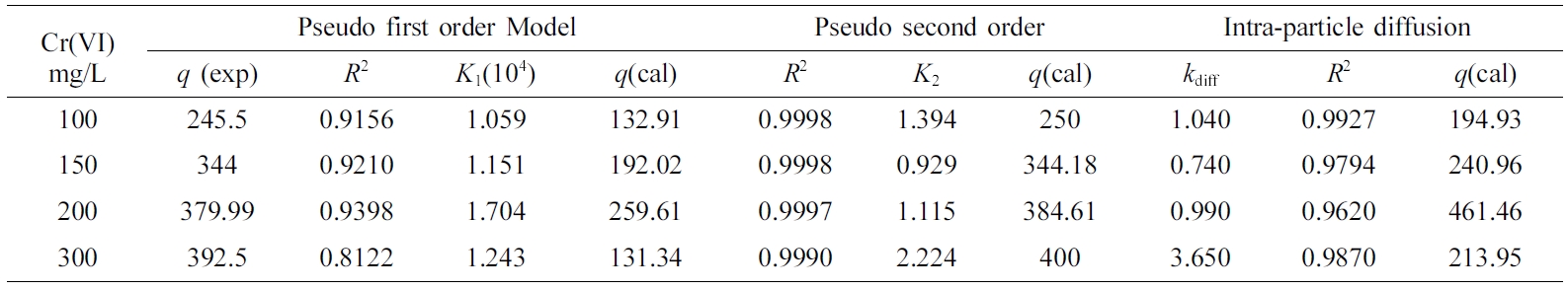 where qe and qt are the amounts of Cr(VI) ions (mg/g) adsorbed at equilibrium and at time t, respectively; K1 and K2 are the rate constant of the pseudo-first order and the pseudo-second order rate constant, respectively; and t (min) is the contact time, kdiff (mg g-1 mn-0.5) is the intra-particle diffusion rate constant and C is the intercept. The kinetic parameters K1, K2, kdiff, qe, qt, C together with R2 are collected in Table 2.