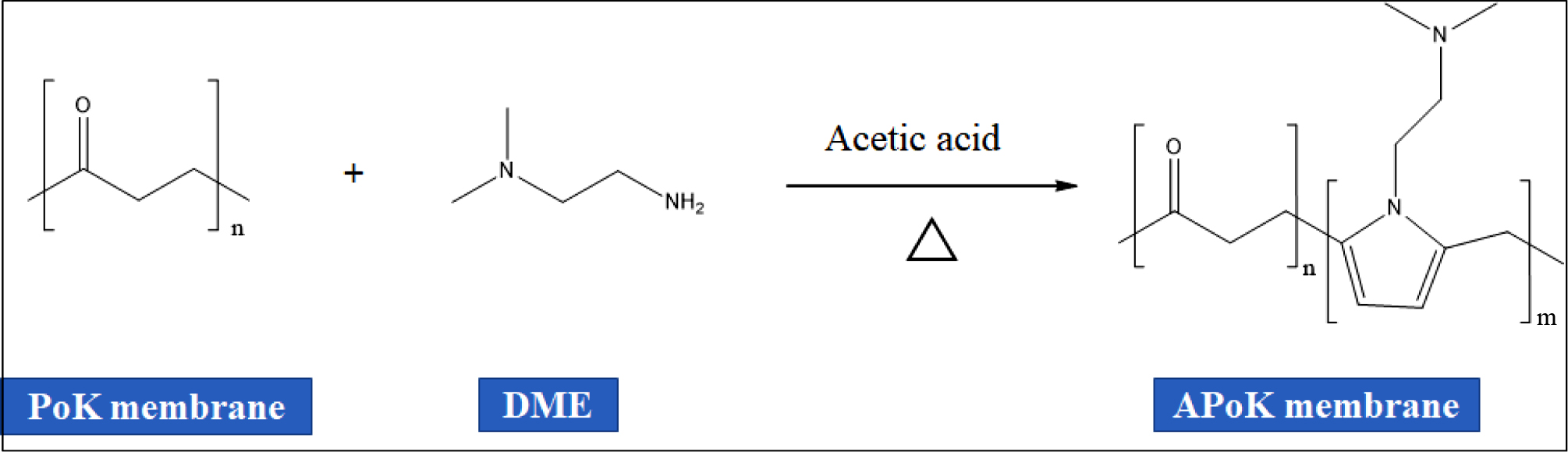 아민화 반응을 위하여 냉각기, 교반기, 온도계, 질소 주입구, 시료주입구가 부착된 100 mL 4구 반응기에 3 cm×3 cm(1.0 g) 크기로 절단한 PoK 막을 넣은 후 여기에 50 mL DMSO를 주입하고, 질소 분위기에서 70 oC까지 가열한 후 온도를 유지하면서 DME를 한 방울씩 적가하였다. 또한 DME와 동일 몰수의 acetic acid를 같은