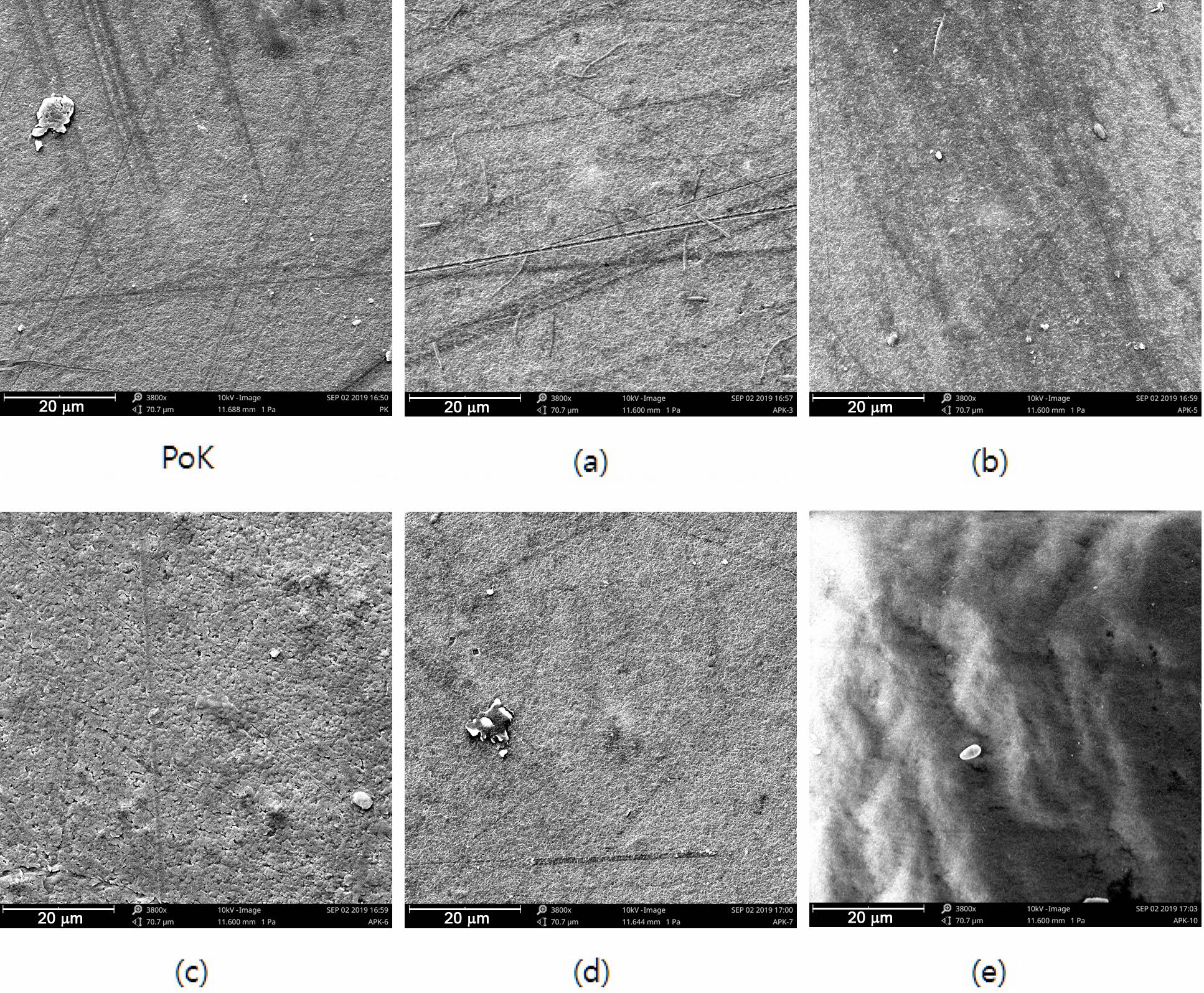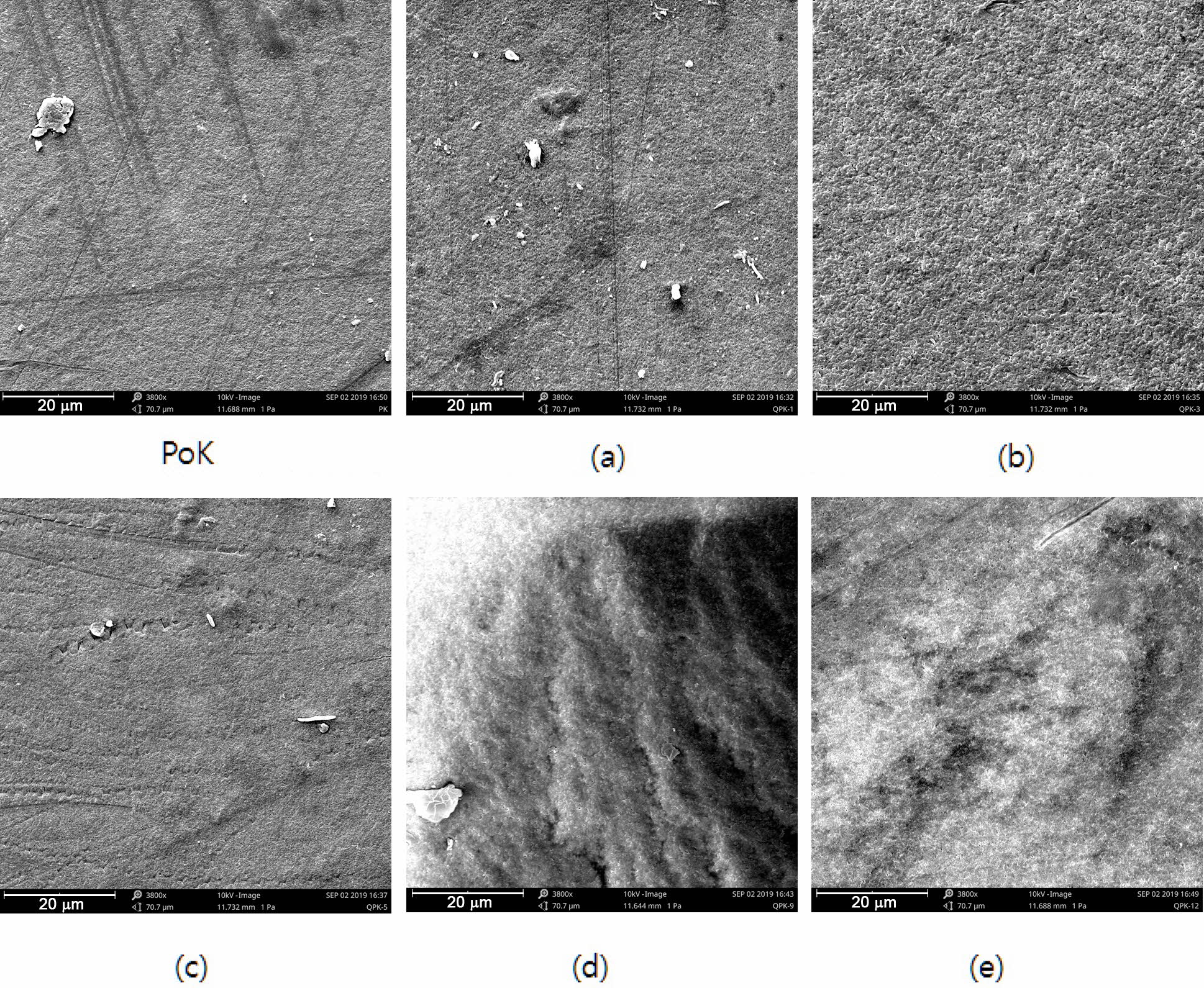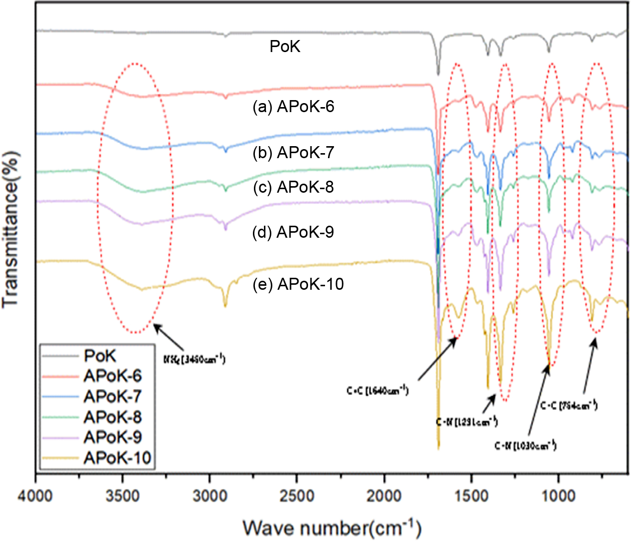 Prestige-21를 이용하여 ATR 방법으로 4000~600 cm-1 범위에서 scan number 20, resolution 4 cm-1로 하여 필름상태로 PoK, APoK, QPoK 막들의