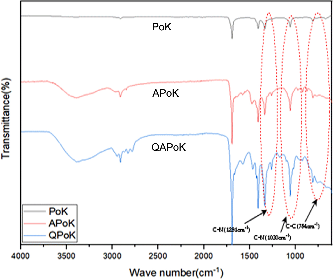 FTIR 스펙트럼 분석. PoK, APoK, QPoK 막의 관능화