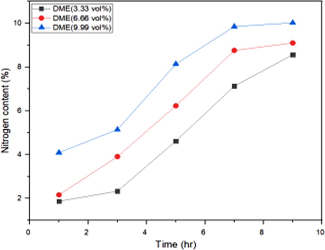 Figure 5 Nitrogen contents of APoK membranes synthesized in various reaction time and DME concentration. |