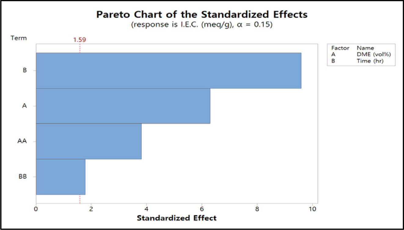 반응시간이 더 큰 영향을 주는 것을 알 수 있다. 물론 DME 농도 또한 표준화된 효과의 유의수준 a 값이 1.59보다 높은 것을 알 수 있다. 따라서 QPoK 음이온 교환막의 이온교환용량에 영향을 주고 교호작용도 있음을 확인할 수 있었다.