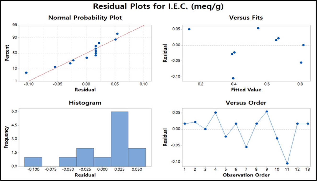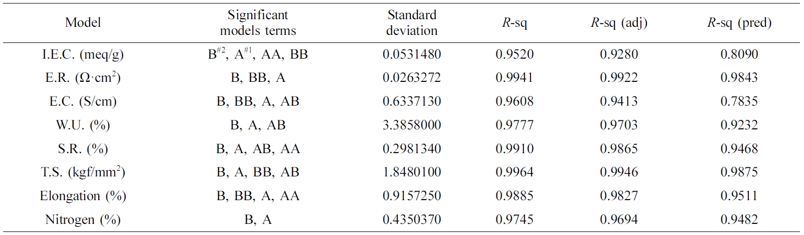 QPoK 음이온 교환막의 이온교환용량, 전환율, 인장강도. 신장률 등이 R-sq 값이 0.9 이상으로 나타났다. 그러나 표준편차에서는 함수율과 막의 인장강도는 각각