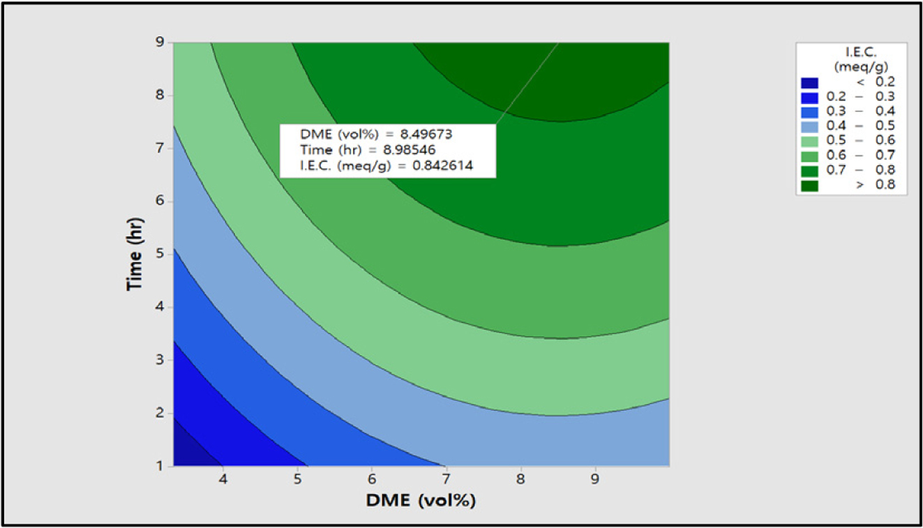 데이터(I.E.C., S.R., E.C.)를 이용하여 RSM 분석을 실시하였으며, 이에 대한 contour plot를 Figure 13, 14, 15에 각각 도시하였다. Figure 13에서 보는 바와 같이 이온교환용량은 DME